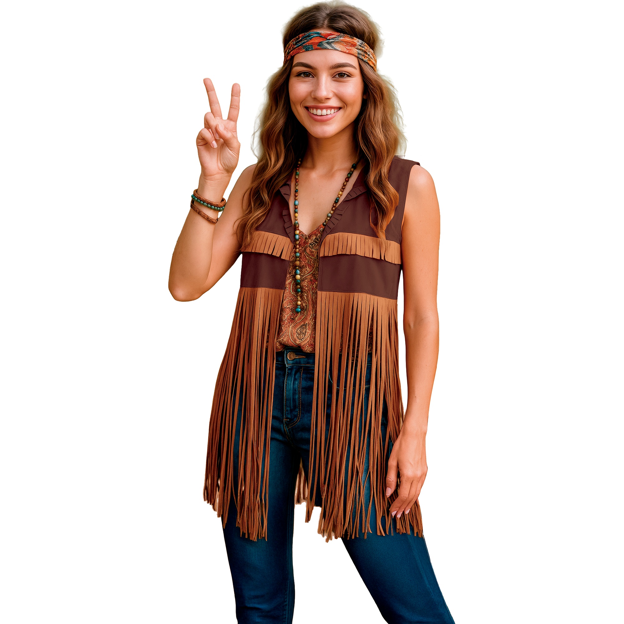 Gilet hippie con frange dal fascino retrò ispirato agli anni '70. Le lunghe frange donano movimento e un tocco bohemien per completare il tuo outfit. Design senza maniche e taglio aperto che facilita l'abbinamento con t-shirt o camicette. Realizzato in poliestere leggero per una piacevole sensazione di comfort.