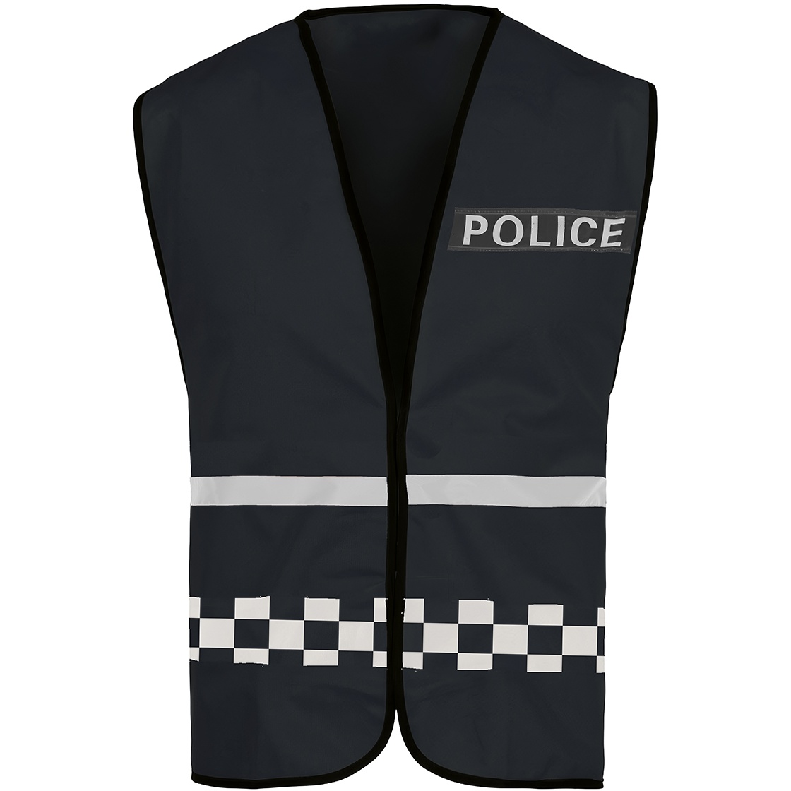 Gilet da poliziotto nero per adulto con scritta "POLICE" e fasce riflettenti che donano un aspetto realistico. Realizzato in poliestere leggero, garantisce comfort e una buona resa estetica per completare qualsiasi look da agente. Design senza maniche con apertura frontale per posizionarlo facilmente sopra gli indumenti. Perfetto per feste, carnevali ed eventi a tema, quando serve un accessorio autentico e semplice da usare.