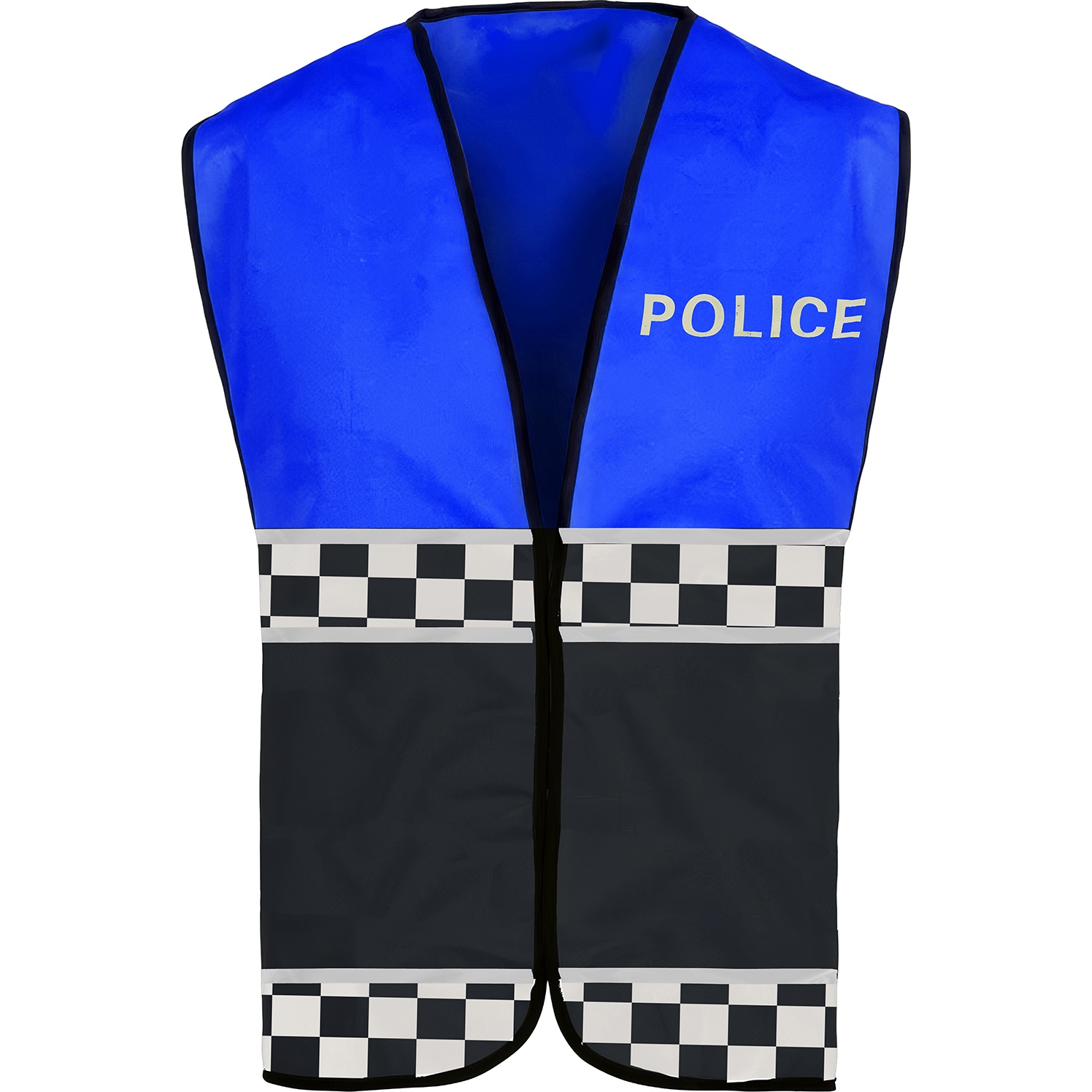 Gilet da polizia blu, taglia adulta, con dettagli visibili che ricreano lo stile di un uniforme realistico. Presenta bande a scacchi e la scritta "POLICE" sul petto per un effetto riconoscibile e d'impatto. Realizzato in poliestere leggero per un utilizzo confortevole e pratico. Apertura frontale che ne facilita l'applicazione e la rimozione rapida.