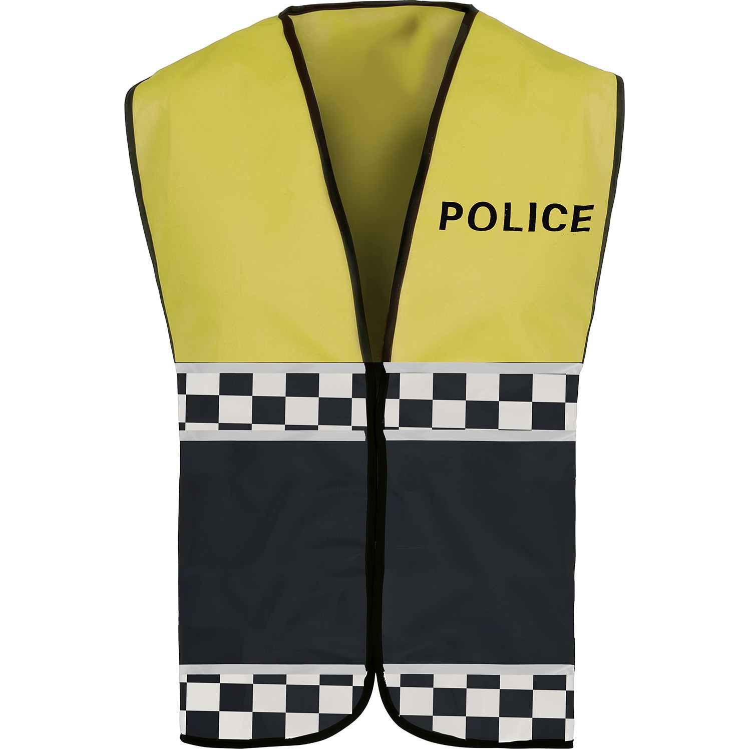 Gilet da polizia giallo per adulto con design ad alta visibilità e fascia a scacchi. Riporta la scritta POLICE sul petto per un effetto realistico. Ideale per carnevale, feste e animazioni, dona un tocco professionale a qualsiasi look da poliziotto. Leggero e confortevole, si chiude facilmente sul davanti per una rapida vestizione.