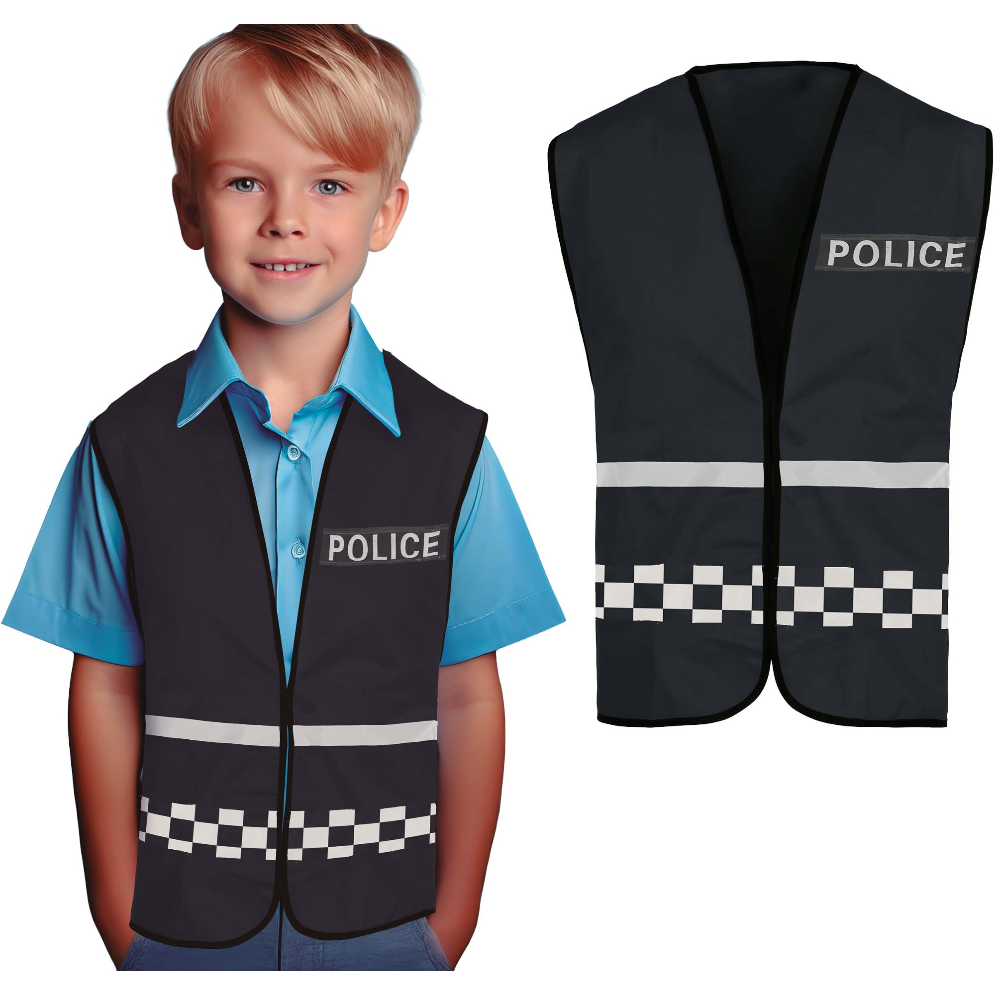 Gilet da polizia nero pensato per costumi e giochi di ruolo dei bambini. Presenta un design realistico con la serigrafia "POLICE" e fasce a scacchi riflettenti che aggiungono stile e visibilità. Realizzato in poliestere leggero e resistente, offre un taglio confortevole che garantisce libertà di movimento durante il gioco. L'apertura frontale rende semplice indossarlo e toglierlo rapidamente. Perfetto per completare il costume da poliziotto e stimolare il gioco di fantasia.
