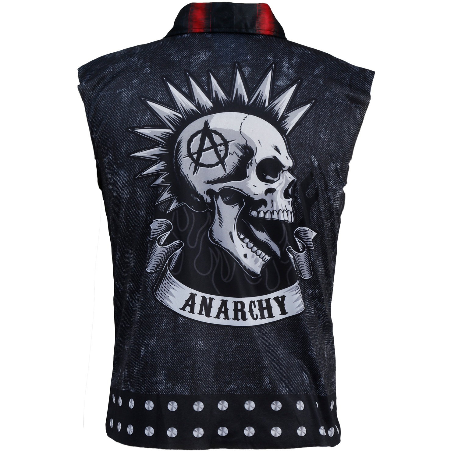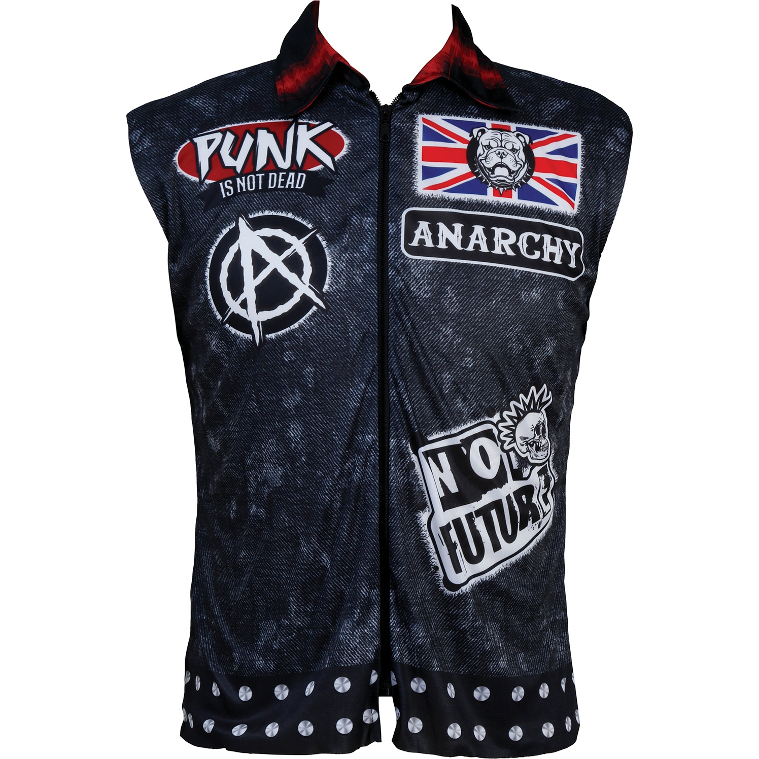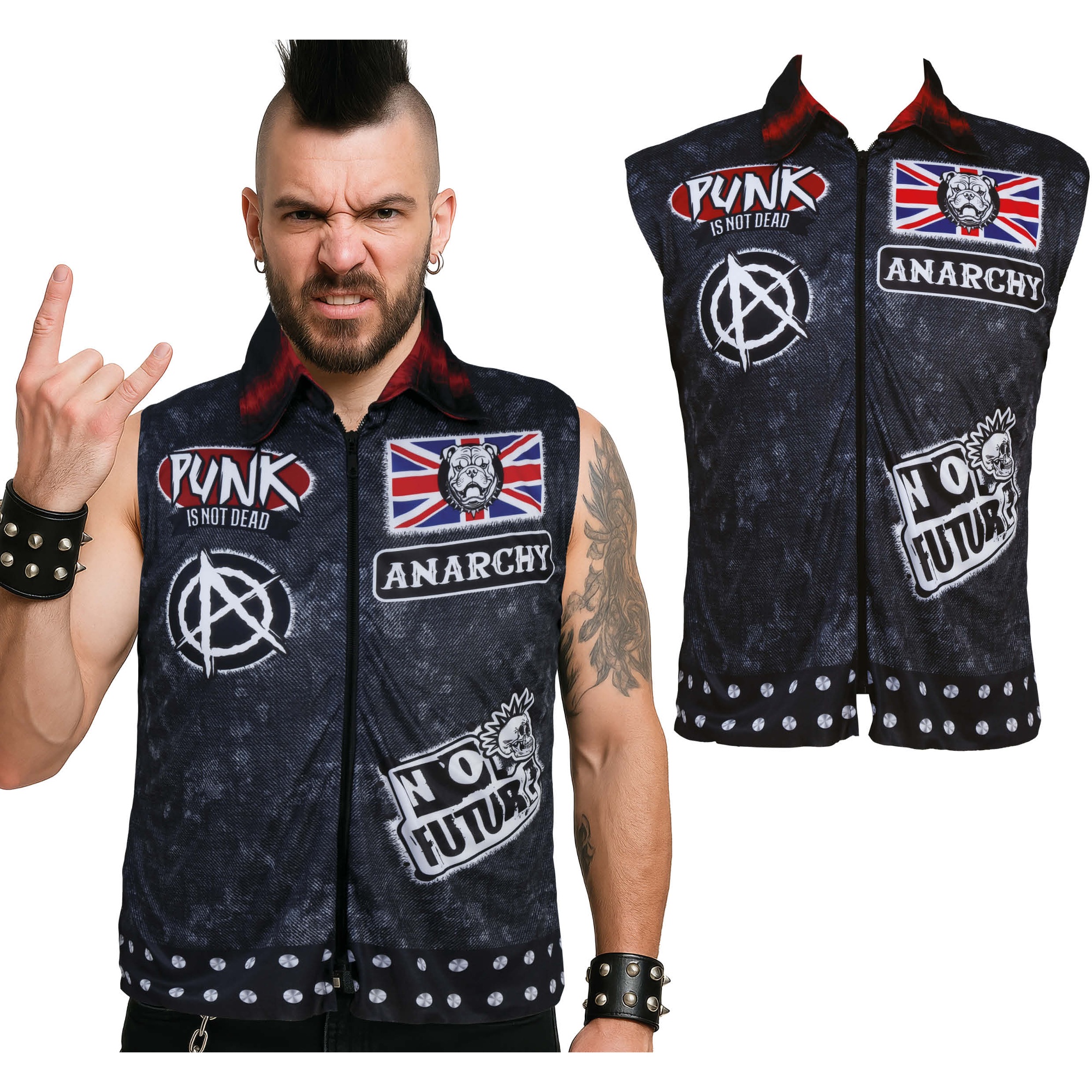 Gilet smanicato dallo stile punk con effetto consumato, perfetto per completare qualsiasi look rock. Realizzato in poliestere, garantisce leggerezza e resistenza per indossarlo sopra una maglia o come elemento distintivo di un costume. Presenta chiusura frontale con zip e stampe a tema anarchia: "PUNK is not dead", "ANARCHY", "NO FUTURE" e bandiera britannica con bulldog. Design pensato per adulti, comodo e ideale per dare un tocco ribelle e autentico al tuo outfit.
