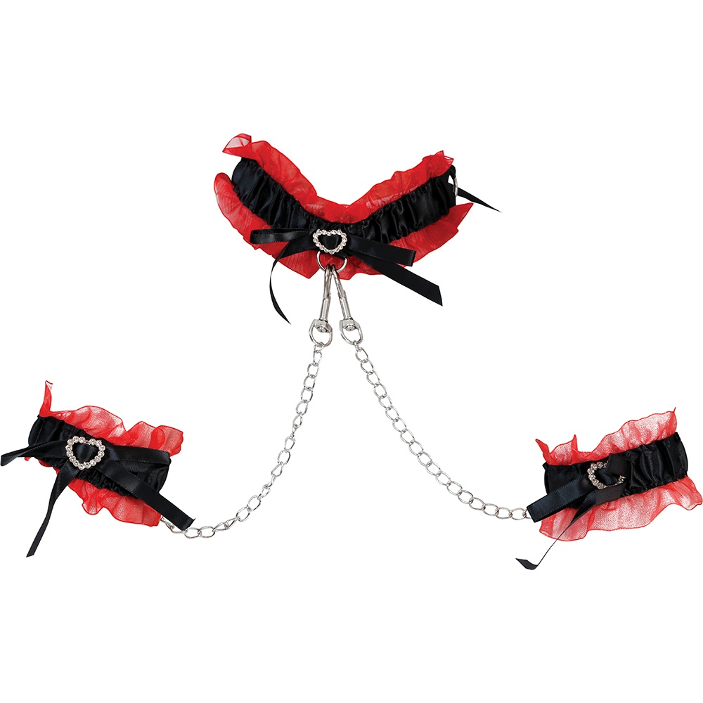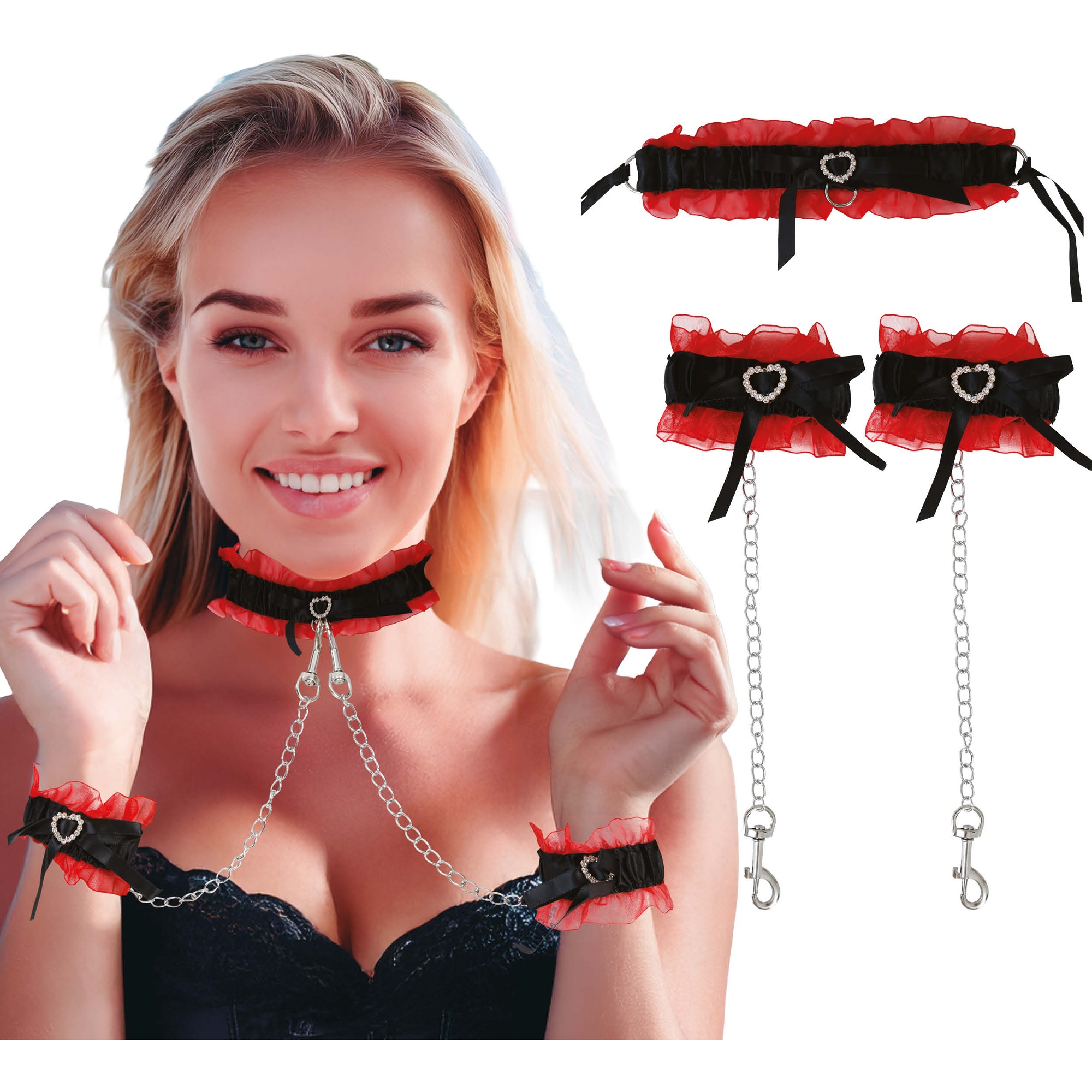 Set sensuale in stile burlesque pensato per valorizzare qualsiasi look provocante. La combinazione di volant rossi, fiocchi neri e dettagli metallici crea un contrasto elegante e d'impatto. Le catene regalano un effetto drammatico e sono rimovibili per adattare lo stile a piacere. Regolabile e confortevole, ideale per servizi fotografici, spettacoli o serate speciali in cui vuoi farti notare.