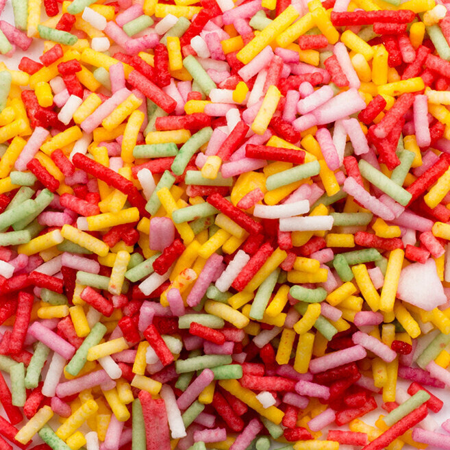 Ingredienti: zucchero, concentrato di prodotti vegetali (ravanello, limone, ribes, cartamo, barbabietola), olio di cocco, acqua, concentrato di alghe (spirulina), sciroppo di glucosio, colorante [E-100] e agente di rivestimento [E-901].