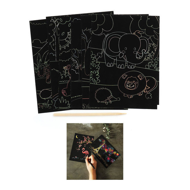 Pacco di 6 fogli creativi da grattare sulla parte anteriore e da colorare sul retro secondo i tuoi gusti con tematica Animali.