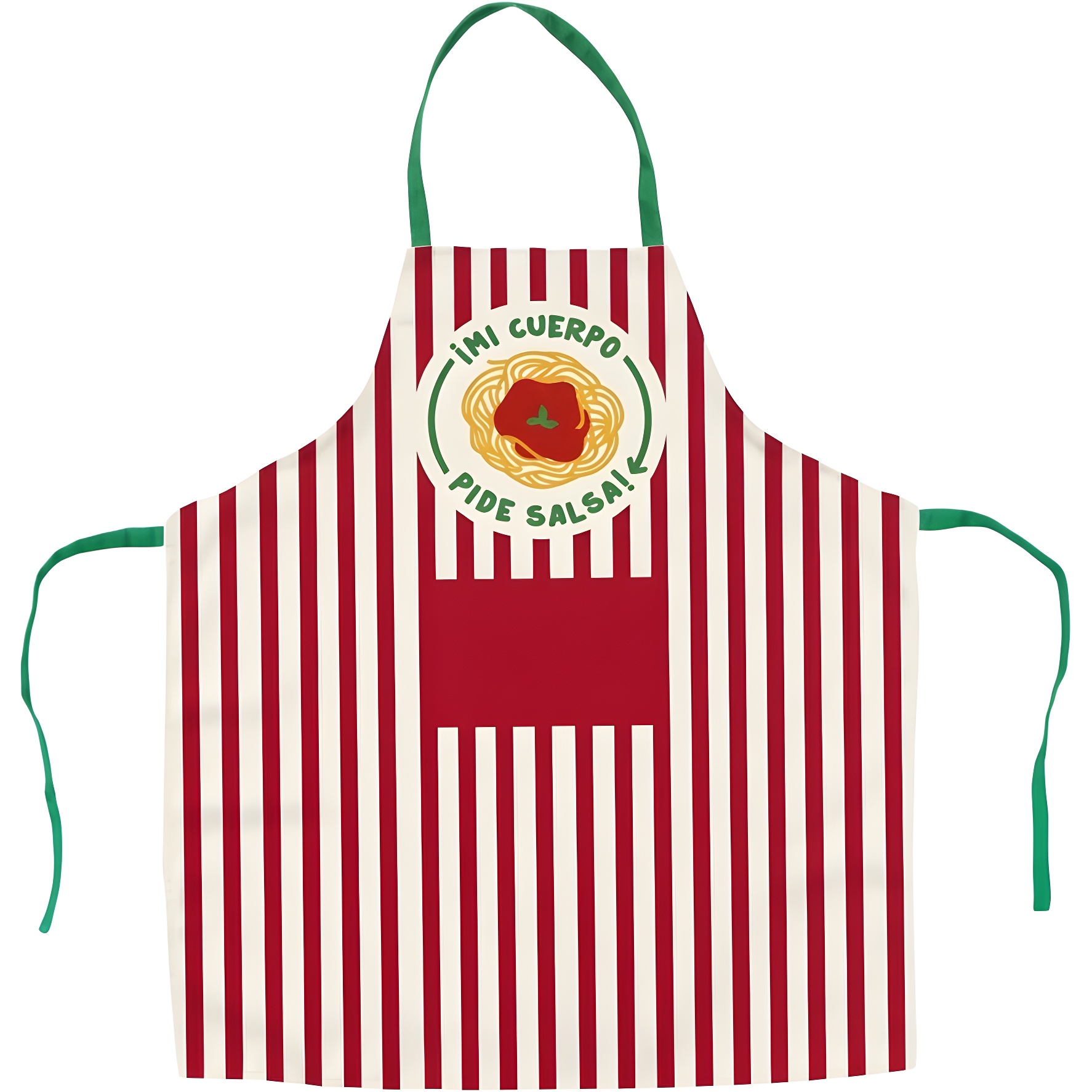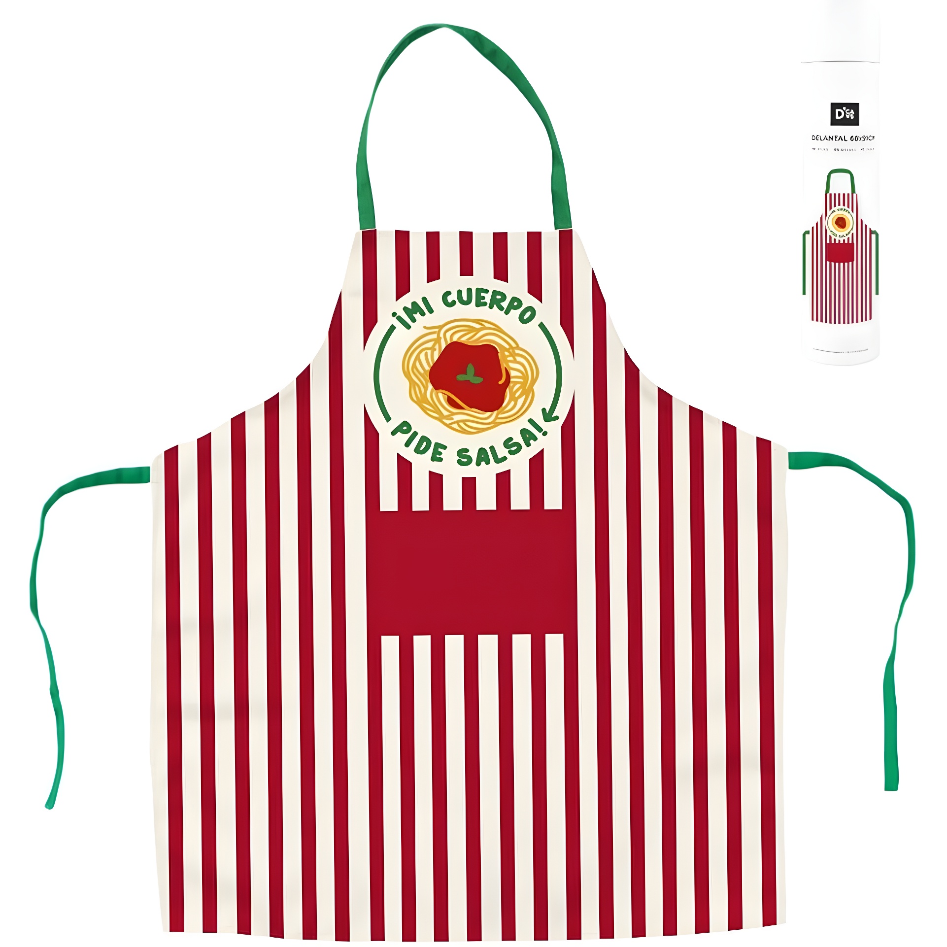 Grembiule per bambini con la divertente stampa "¡Mi cuerpo pide salsa!", pensato per i piccoli chef dai 4 agli 8 anni. Il motivo a righe e il dettaglio della pasta donano un tocco allegro e originale sia in cucina sia durante le attività manuali.
