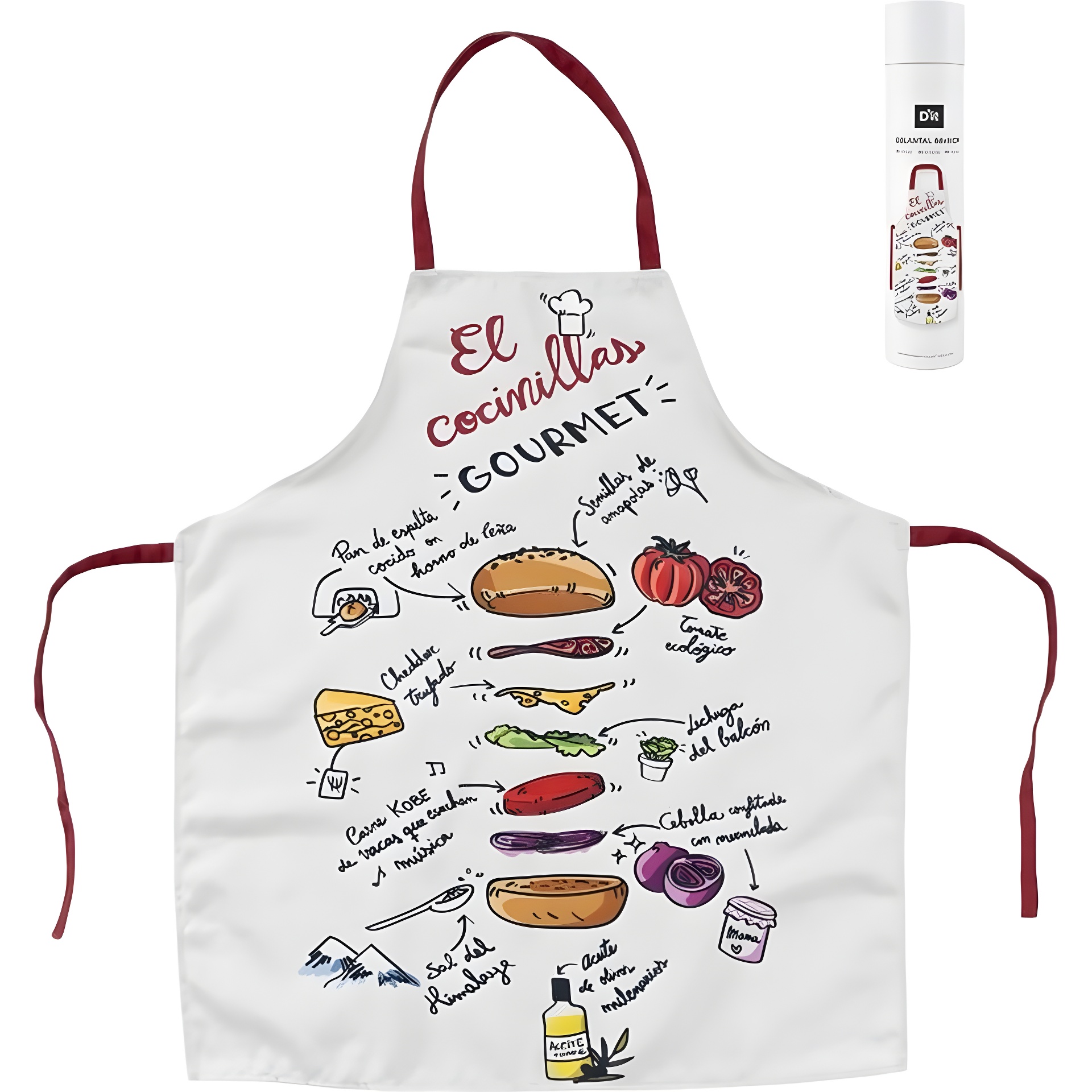 Grembiule divertente per bambini con una stampa che riproduce la ricetta di un hamburger in stile gourmet, pensato per ispirare i piccoli chef. Il motivo mostra gli ingredienti e l'ordine di montaggio in modo chiaro e visivo, stimolando l'apprendimento mentre si gioca.