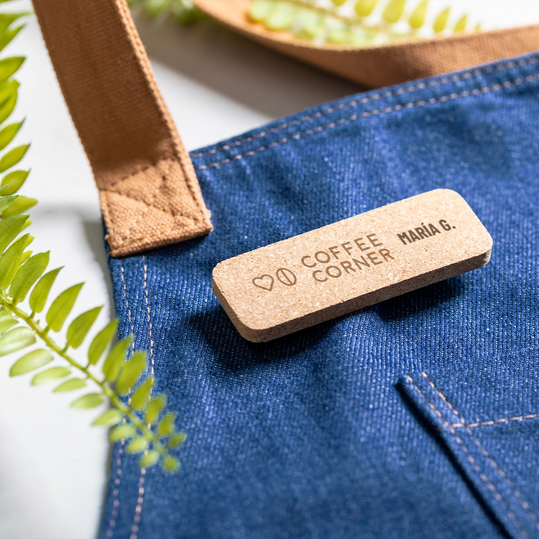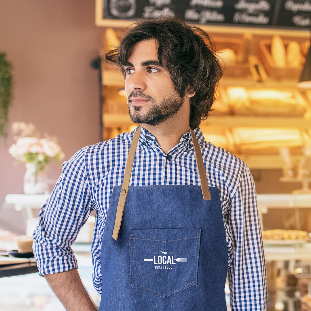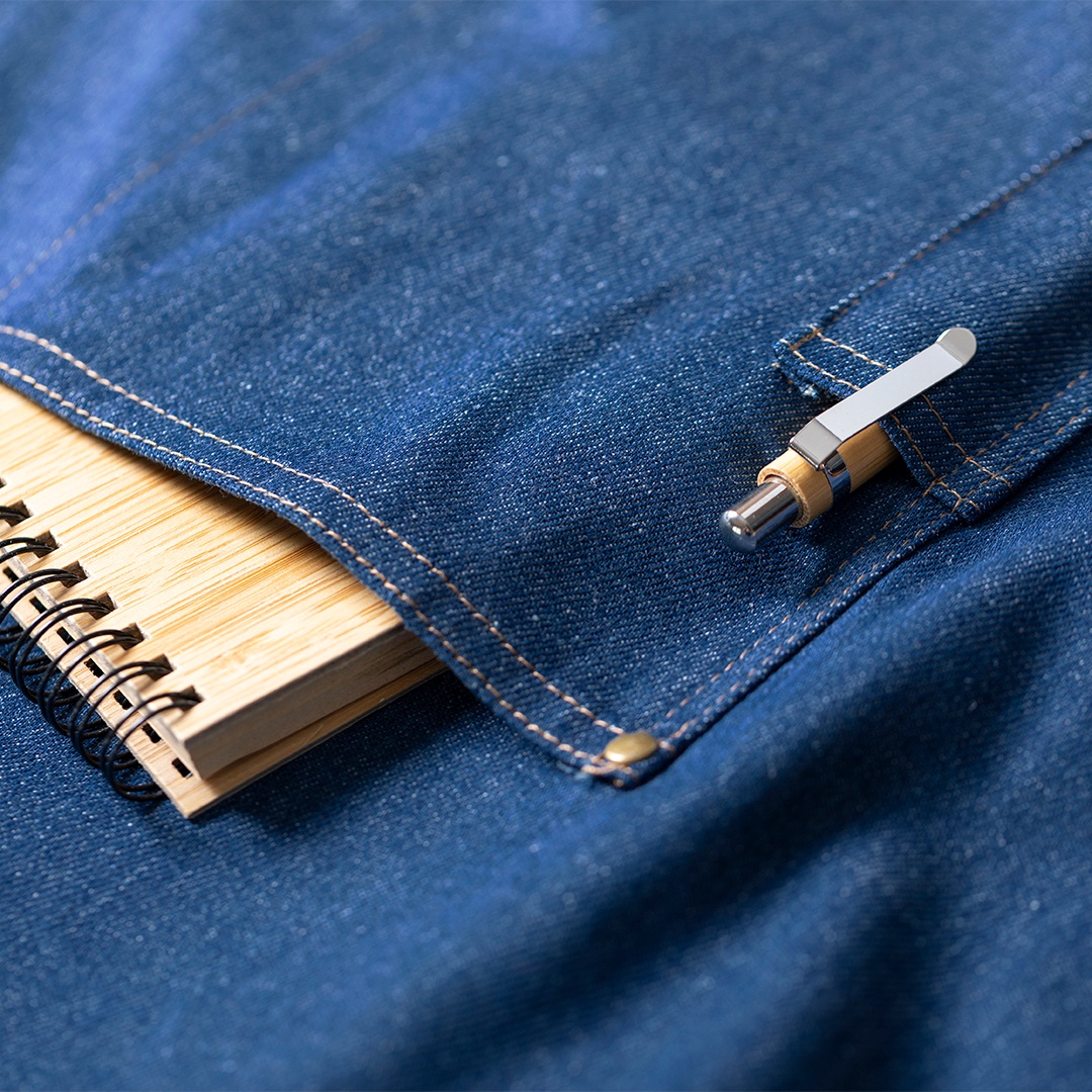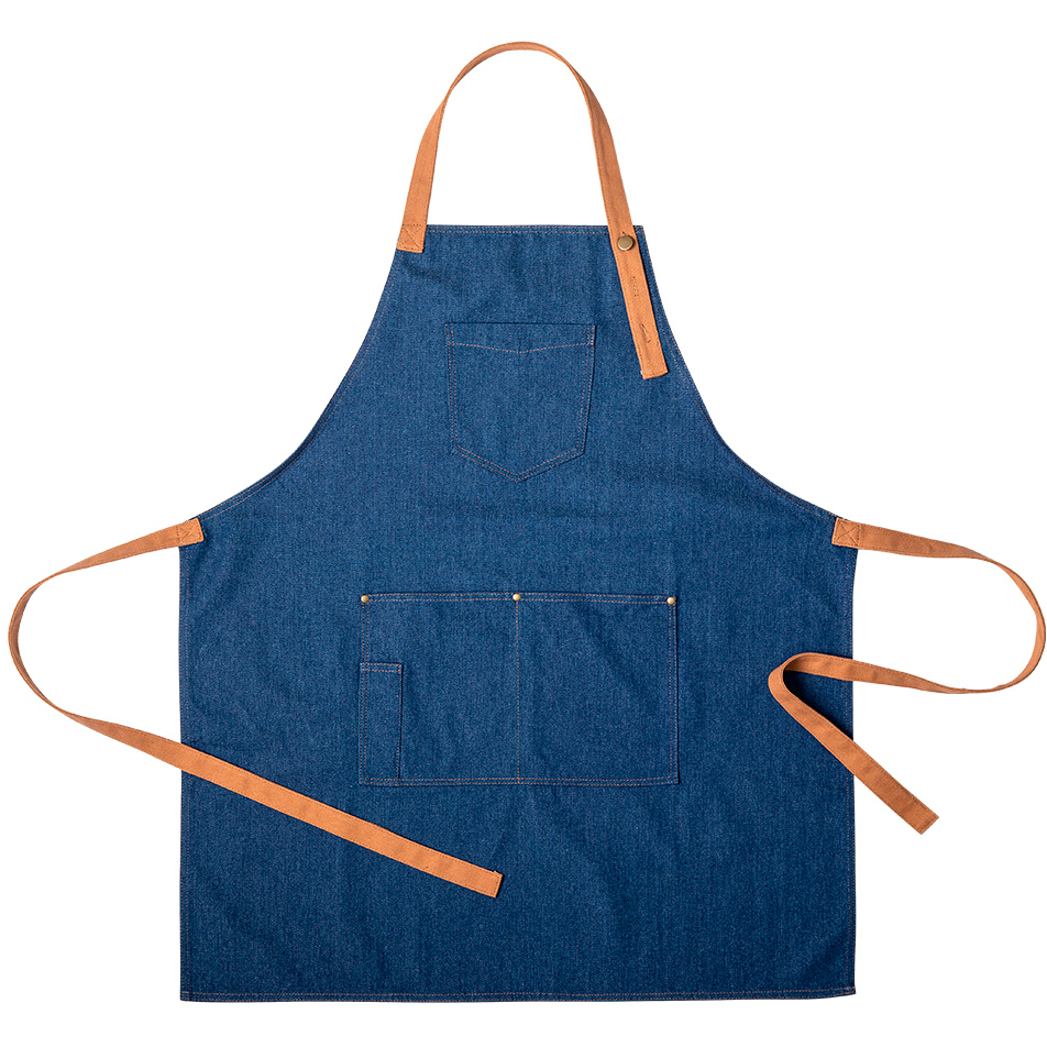 - Grembiule di alta qualità in resistente tessuto denim.
