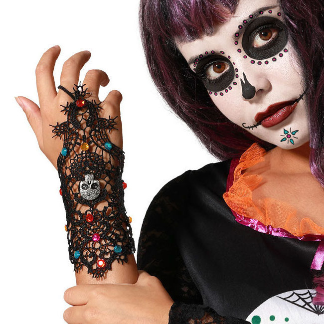 • Guanto a rete nero con teschio metallico e pietre preziose multicolori. Ideale per costumi da Catrina o la Morte messicana.