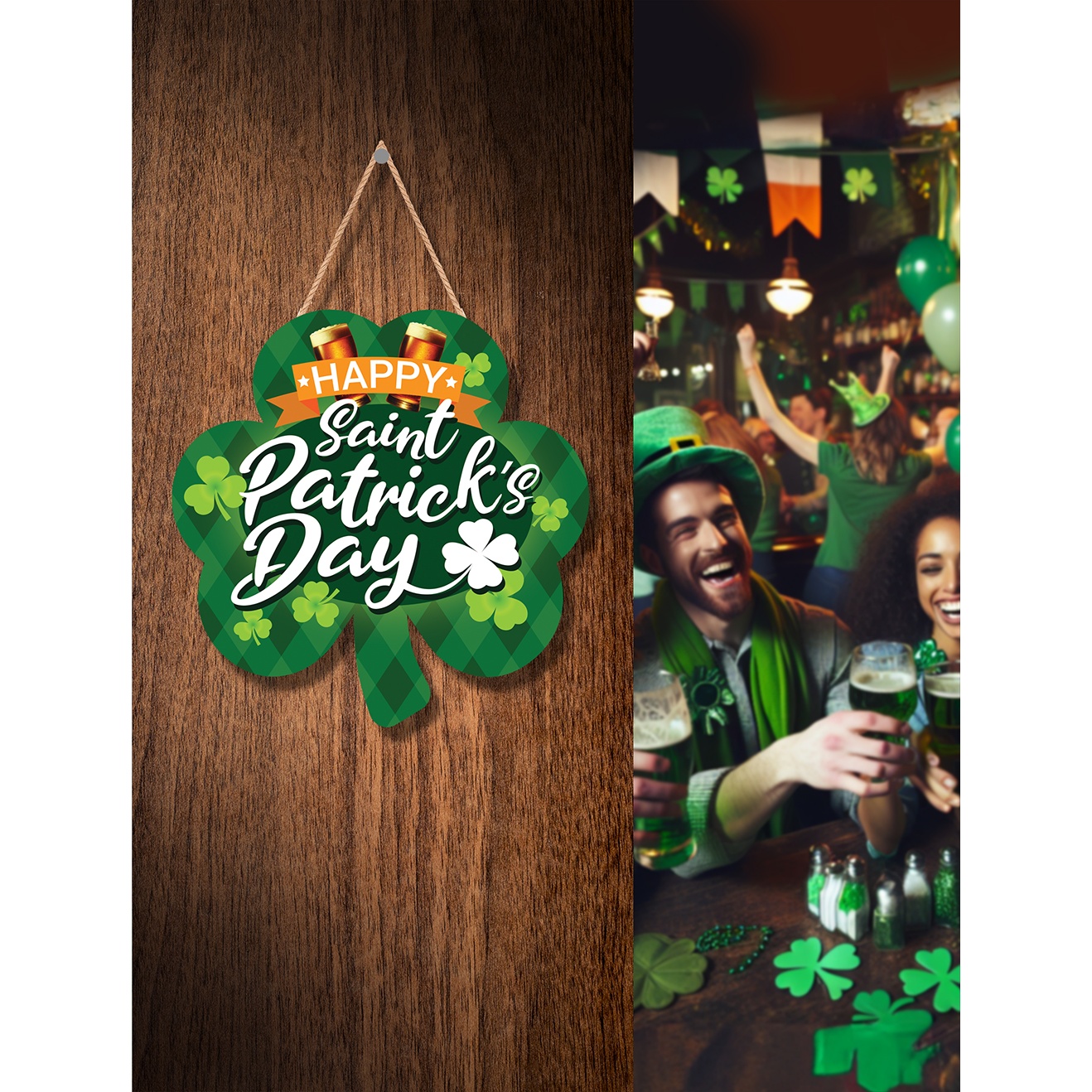 - Design iconico a forma di trifoglio con lettering festoso per creare l'atmosfera durante le celebrazioni di San Patrizio.