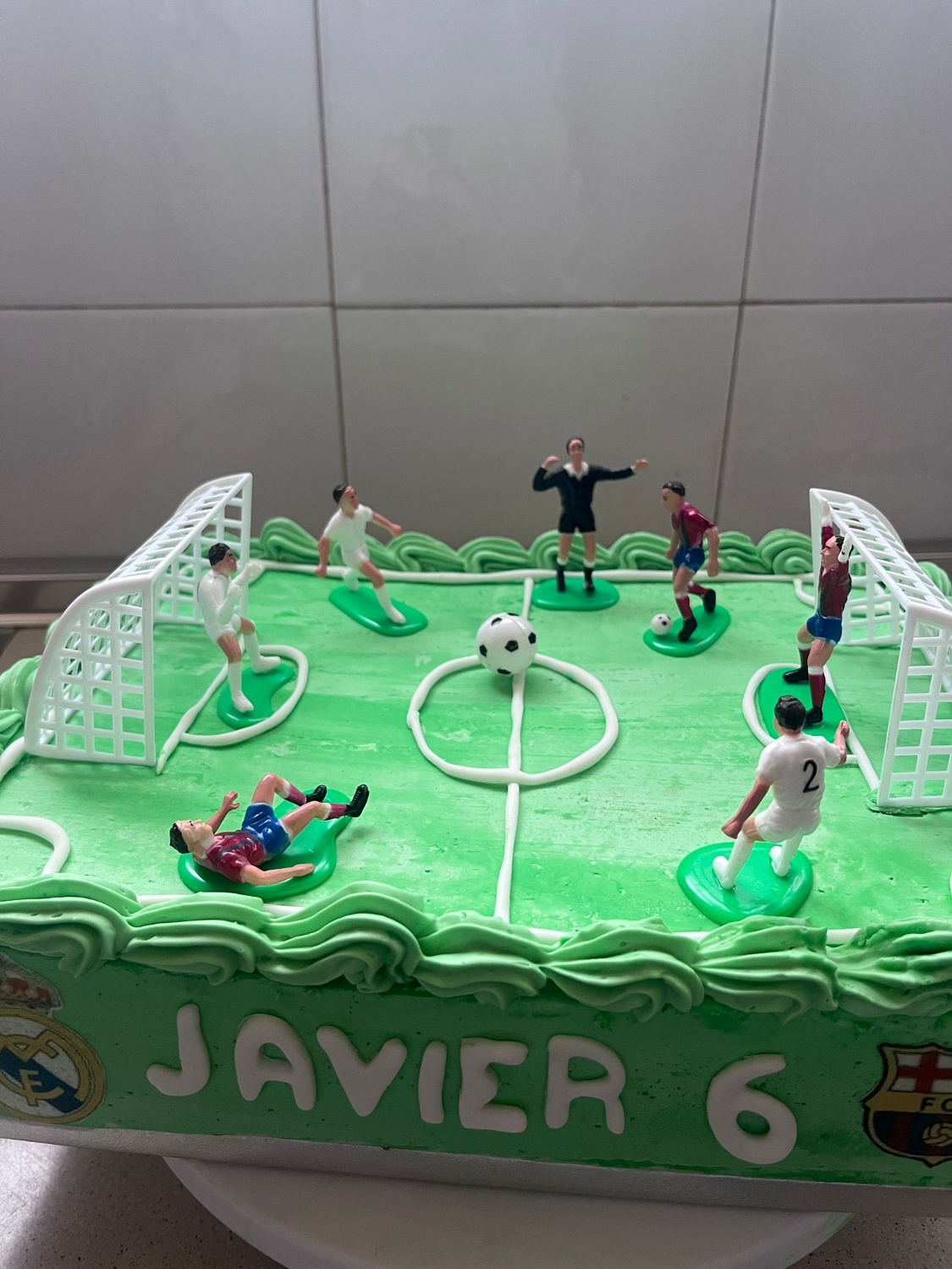 Questo prodotto è composto da 4 figure di calciatori con maglie e pantaloncini bianchi e blu, 1 arbitro in uniforme nera e 2 porte. Ogni figura è dotata di una base verde che ne facilita il posizionamento sulla torta.