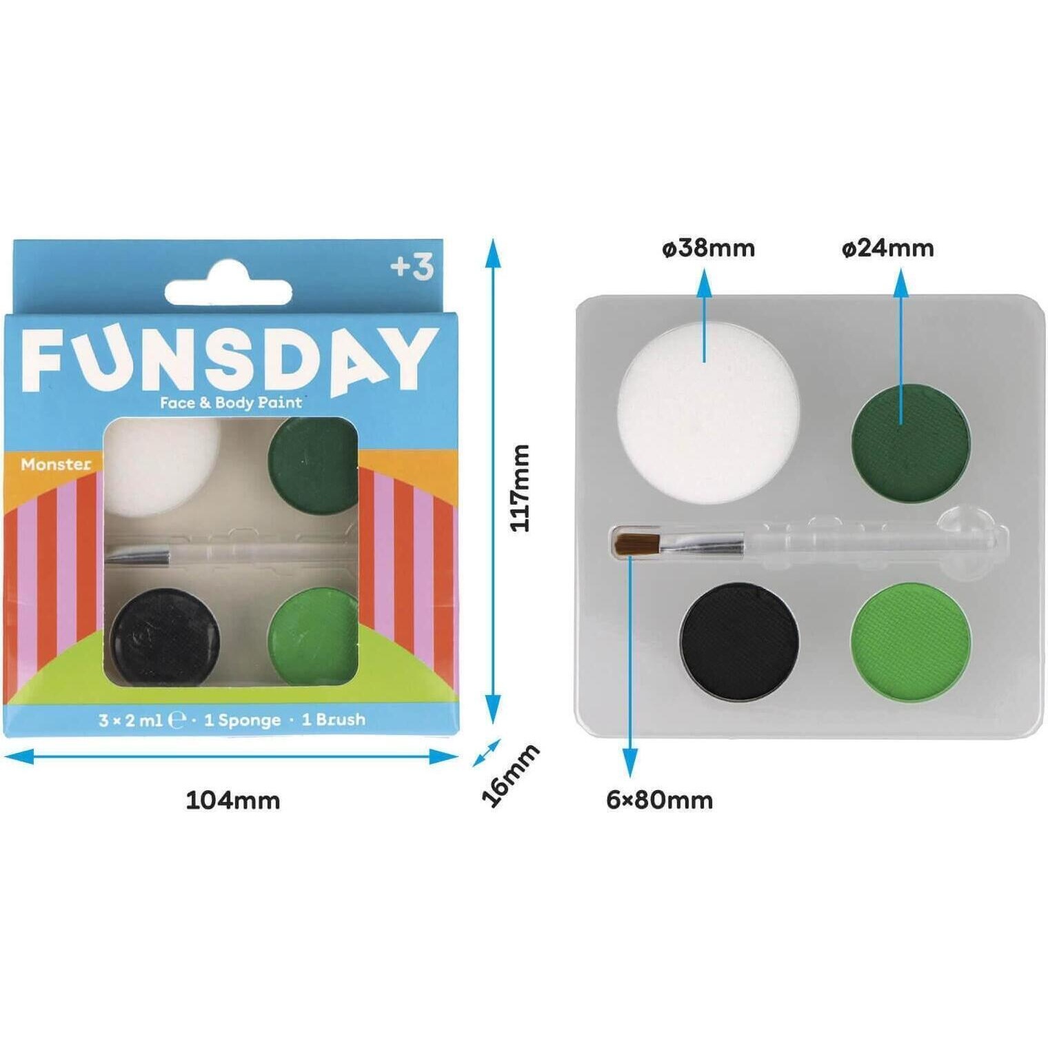 - Kit con 3 colori per trucco facciale a tema dinosauro (verde chiaro, verde scuro e nero) con pennello e spugna. Facili da applicare, garantiscono risultati vivaci e duraturi. Ideale per travestimenti, feste, festival, carnevale o Halloween.