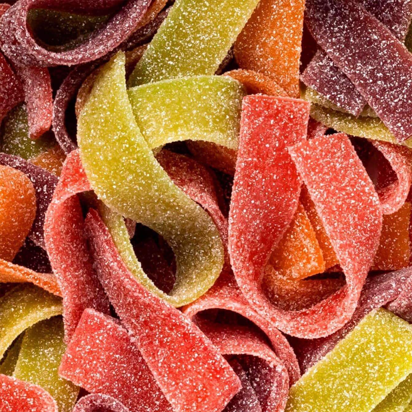 Ingredienti: zucchero, sciroppo di glucosio e fruttosio, farina di grano (contiene glutine), acidificanti: acido malico, acido citrico, acido lattico; destrosio, grasso di palma, amido di mais, correttore di acidità: malati di sodio, lattato di sodio, citrati di potassio; concentrato vegetale: cartamo, spirulina, mela, zucca, carota, mirtillo, ribes nero, ravanello, pomodoro; aromi, antiossidante: acido ascorbico; sale.