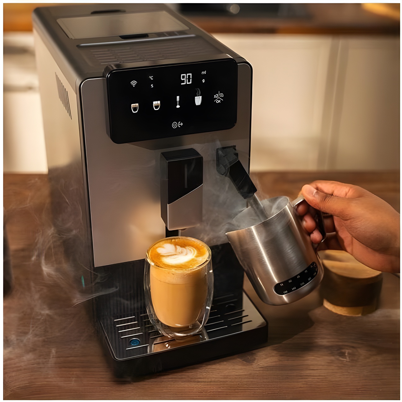 La Cecotec Cremmaet Steam è una macchina da caffè superautomatica che prepara espresso e bevande a base di latte in modo semplice e veloce, grazie al macinacaffè integrato e al lancia vapore per una schiuma cremosa.