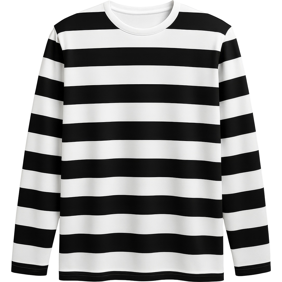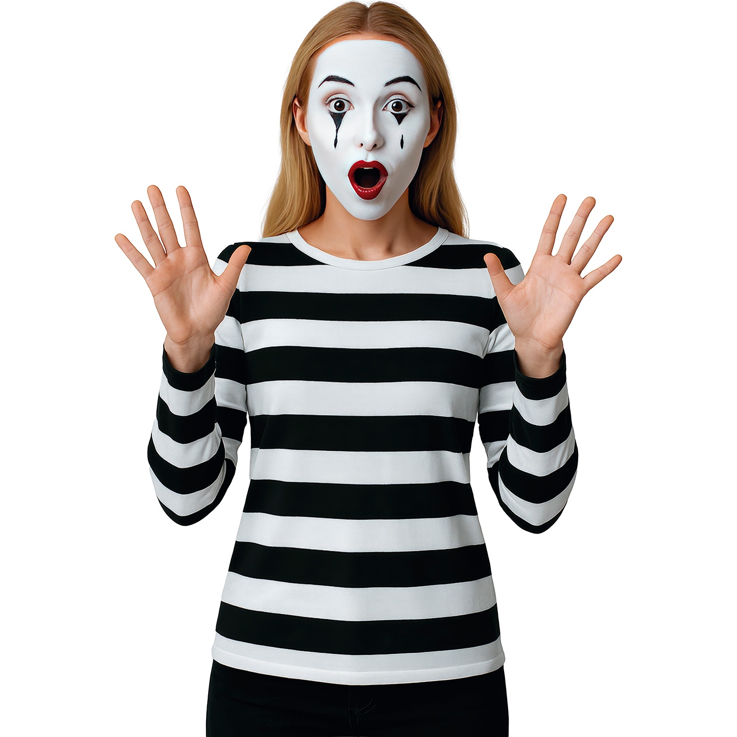 Maglia a righe orizzontali bianche e nere pensata per ricreare il look classico del mimo. Presenta un taglio dritto e maniche lunghe che conferiscono un effetto senza tempo e la rendono facile da abbinare. Realizzata in poliestere, garantisce leggerezza e una bella caduta, perfetta per eventi e performance. Ideale come pezzo centrale di un outfit a tema o come complemento per costumi teatrali.