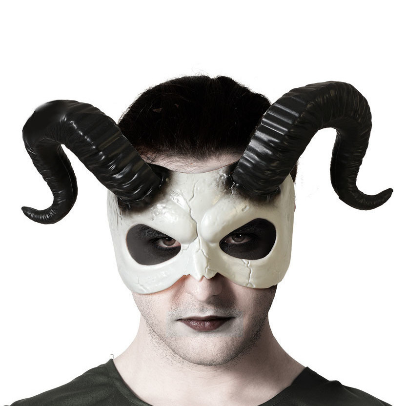 • Mezzamaschera bianca crepata con lunghe corna nere e uno sguardo penetrante. Ideale per costumi da demone, creatura magica o fauno oscuro.