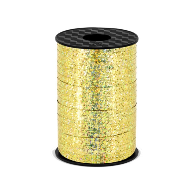 Bobina di nastro in materiale plastico, con una larghezza di 5 mm e una lunghezza totale di 225 m, disponibile in colore oro metallico e argento, con un aspetto lucente con tonalità multicolori.