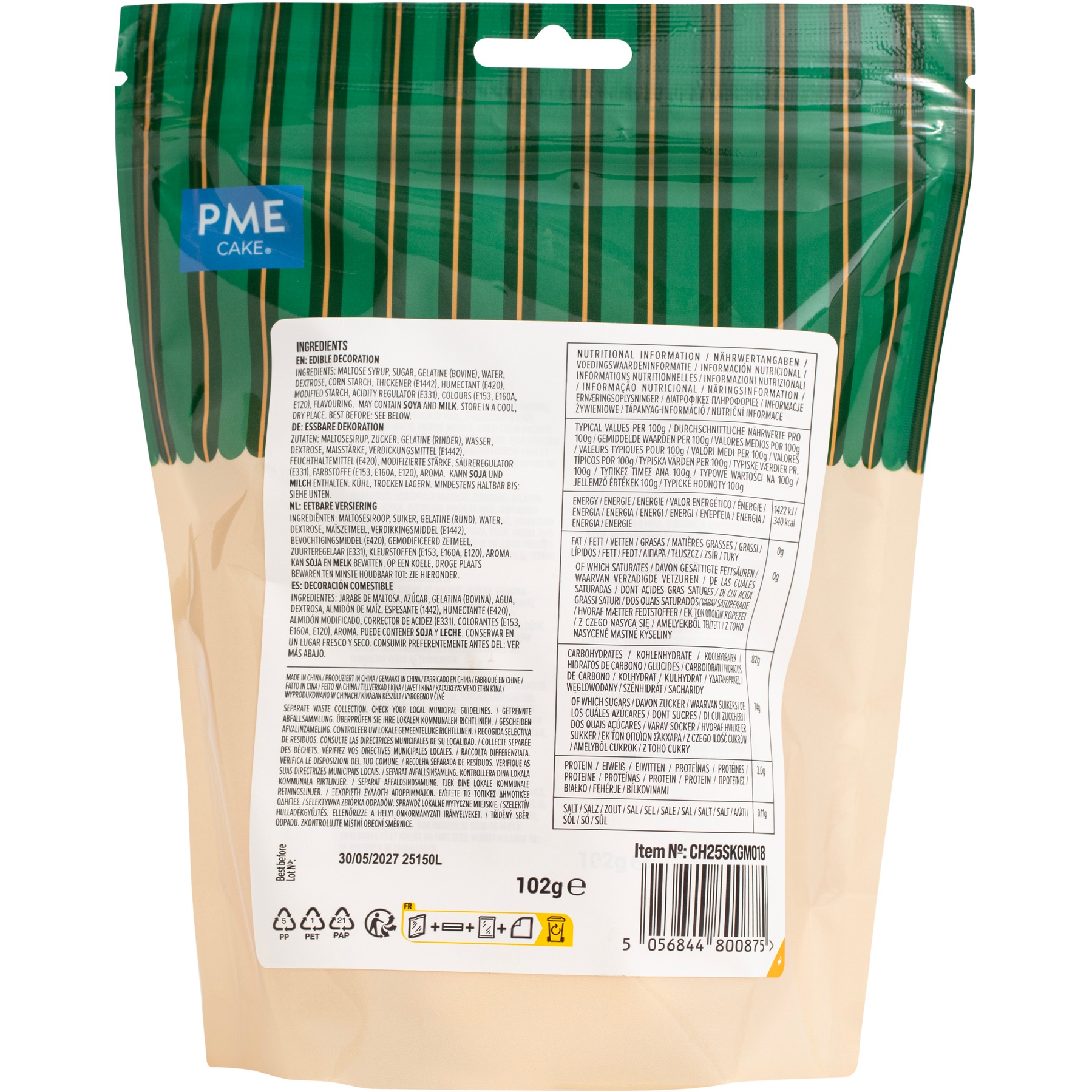 Ingredienti: sciroppo di maltosio, zucchero, gelatina (bovina), acqua, destrosio, amido di mais, addensante (1442), umidificante (E420), amido modificato, correttore di acidità (E331), coloranti (E153, E160A, E120), aroma.