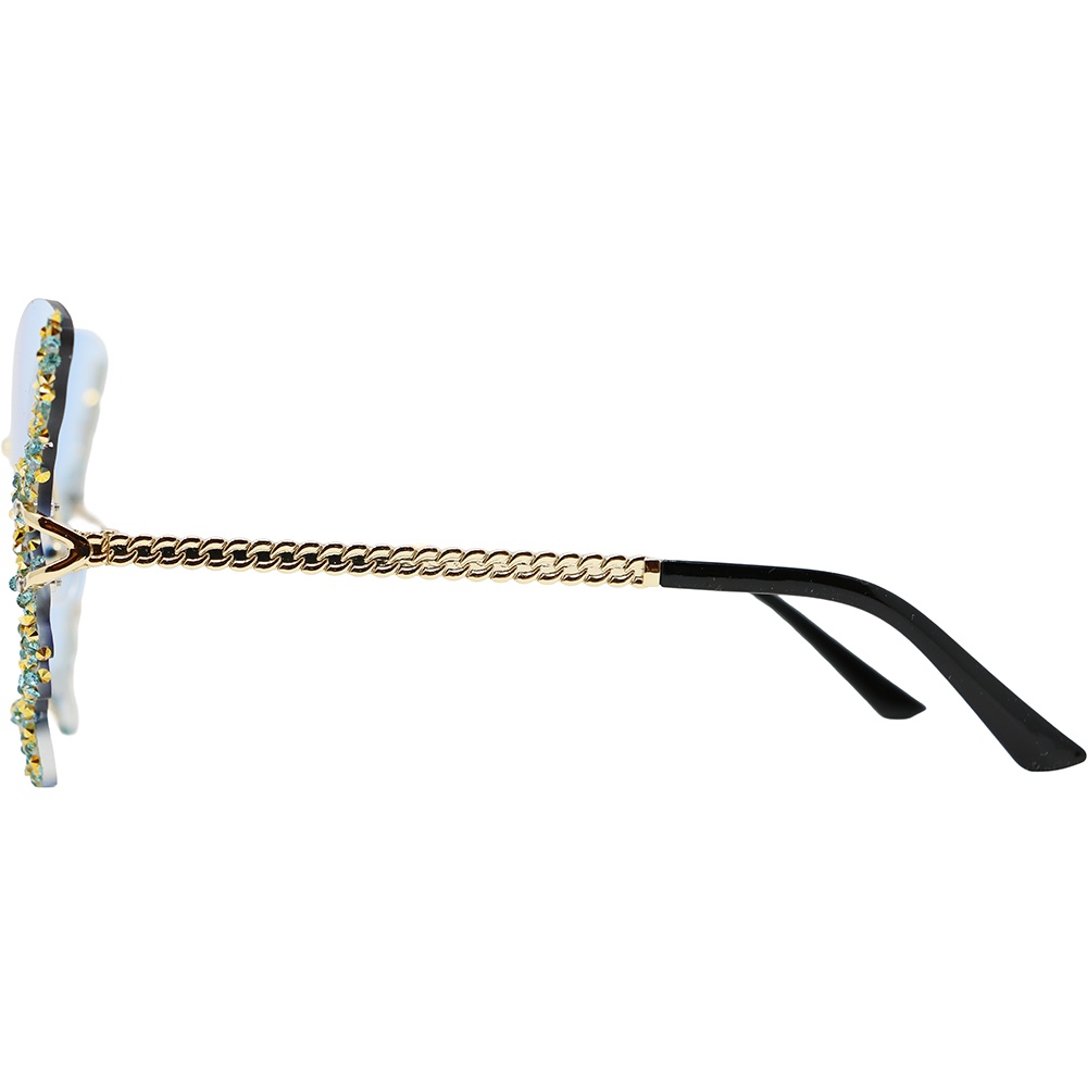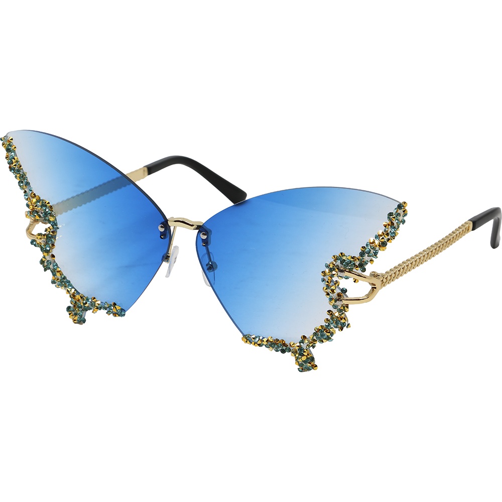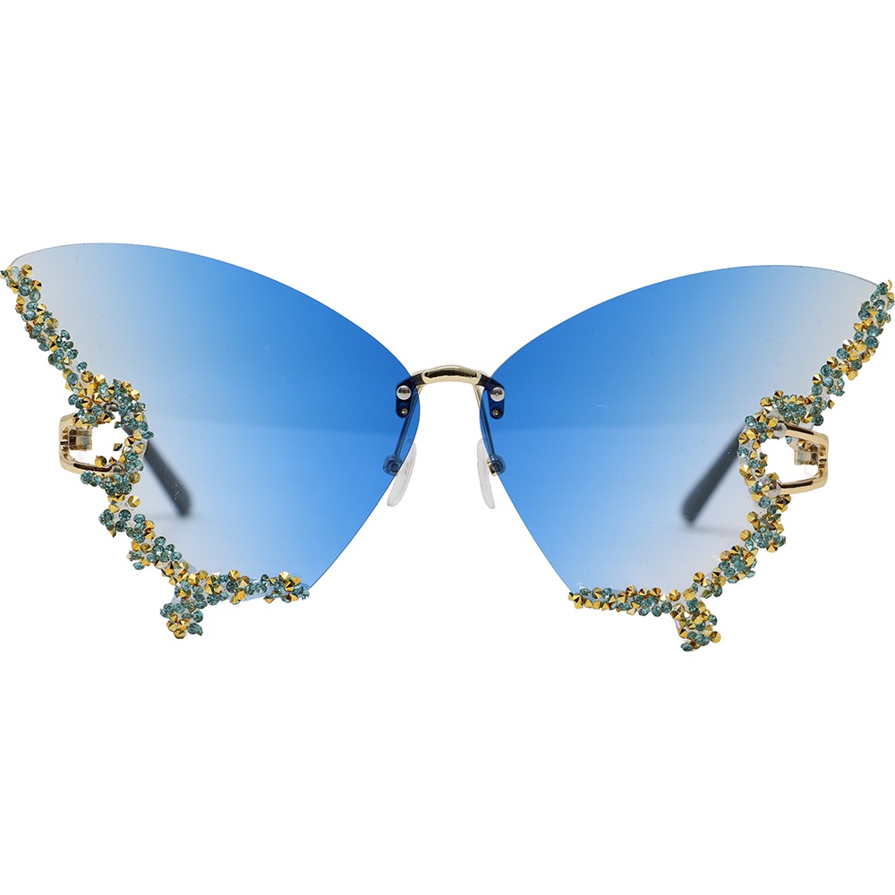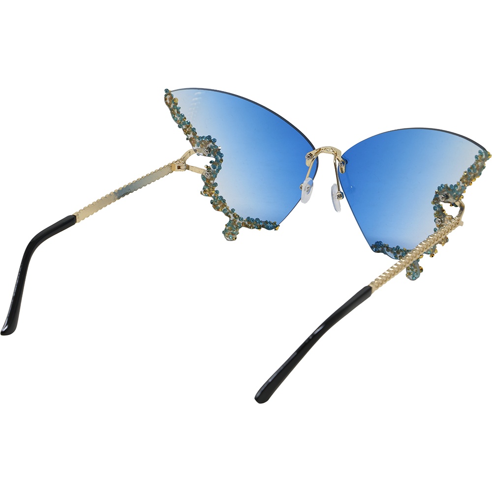 Occhiali a farfalla con strass che aggiungono un tocco boho e scenografico al tuo look. Ideali per festival e occasioni in cui vuoi distinguerti con stile e brillantezza. Lenti in vetro tintate in blu per un'estetica vivace, montatura metallica leggera con naselli regolabili per una calzata confortevole e dettagli in strass che riflettono la luce trasformando ogni sguardo nella protagonista.