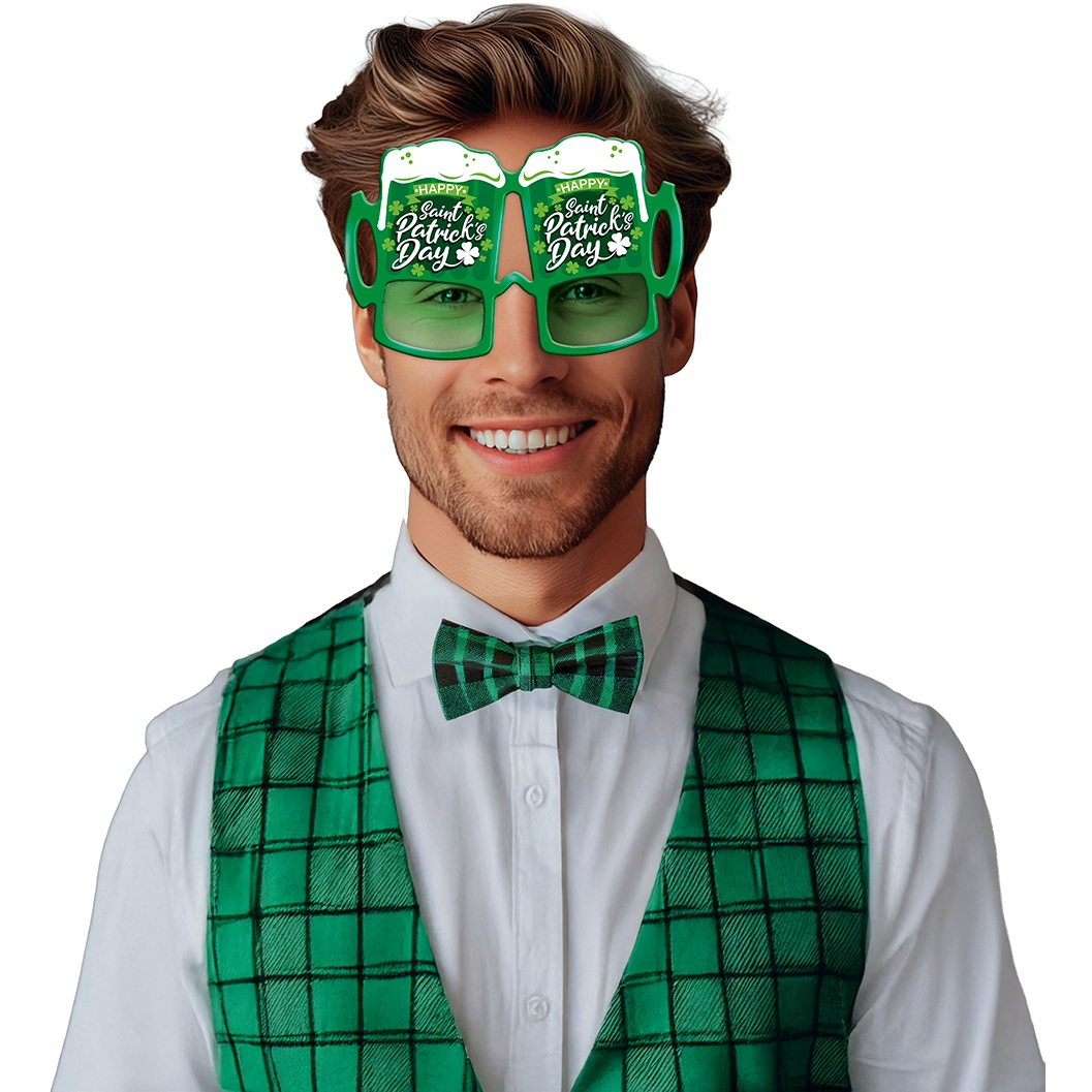 Fatti notare alle tue celebrazioni con questi occhiali a forma di boccale recanti la scritta "Saint Patrick's Day".