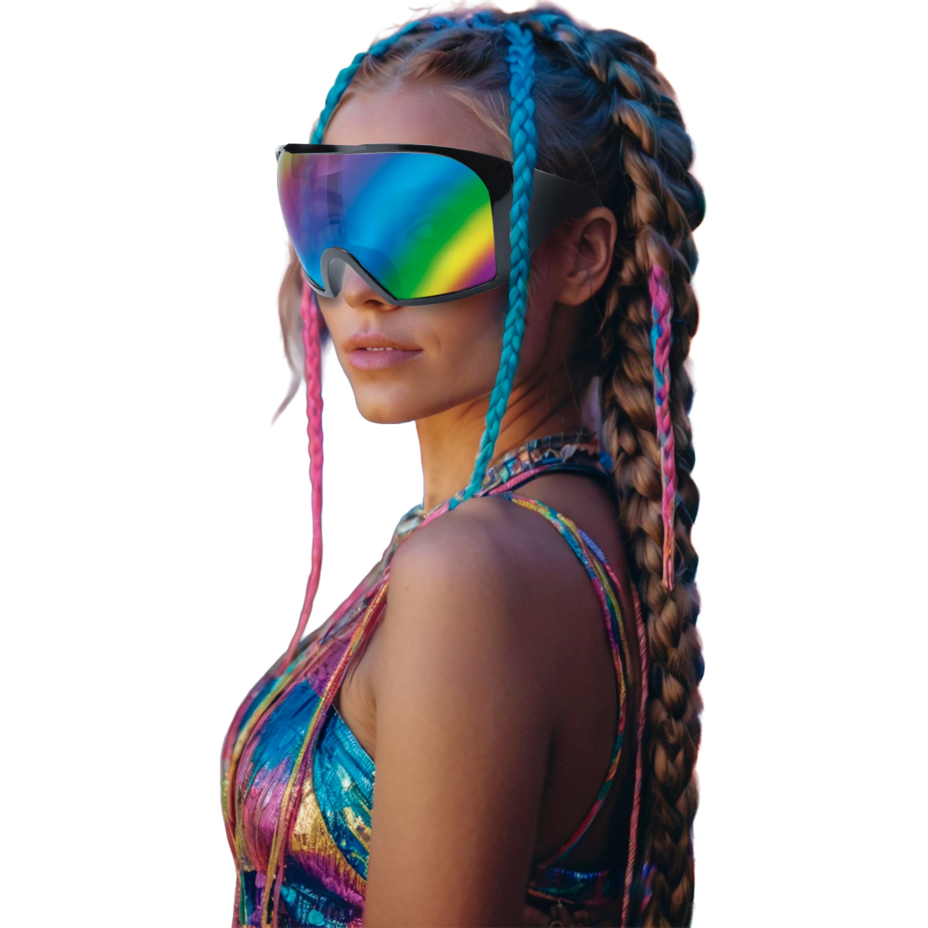 Occhiali futuristici con lente specchiata multicolor ad alto impatto visivo. Il design panoramico e curvo crea un effetto cyber e contemporaneo che valorizza qualsiasi look creativo. Montatura leggera in PVC e fascia elastica larga assicurano una calzata comoda e stabile. La lente riflettente cambia tonalità a seconda dell'illuminazione, offrendo risultati dinamici in foto e performance. Accessorio d'impatto pensato per farti risaltare in eventi, servizi fotografici e outfit dal forte carattere.