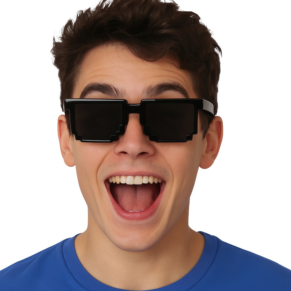 Occhiali Pixel neri dallo stile 8-bit, molto divertenti e perfetti per animare le tue feste e i photocall.