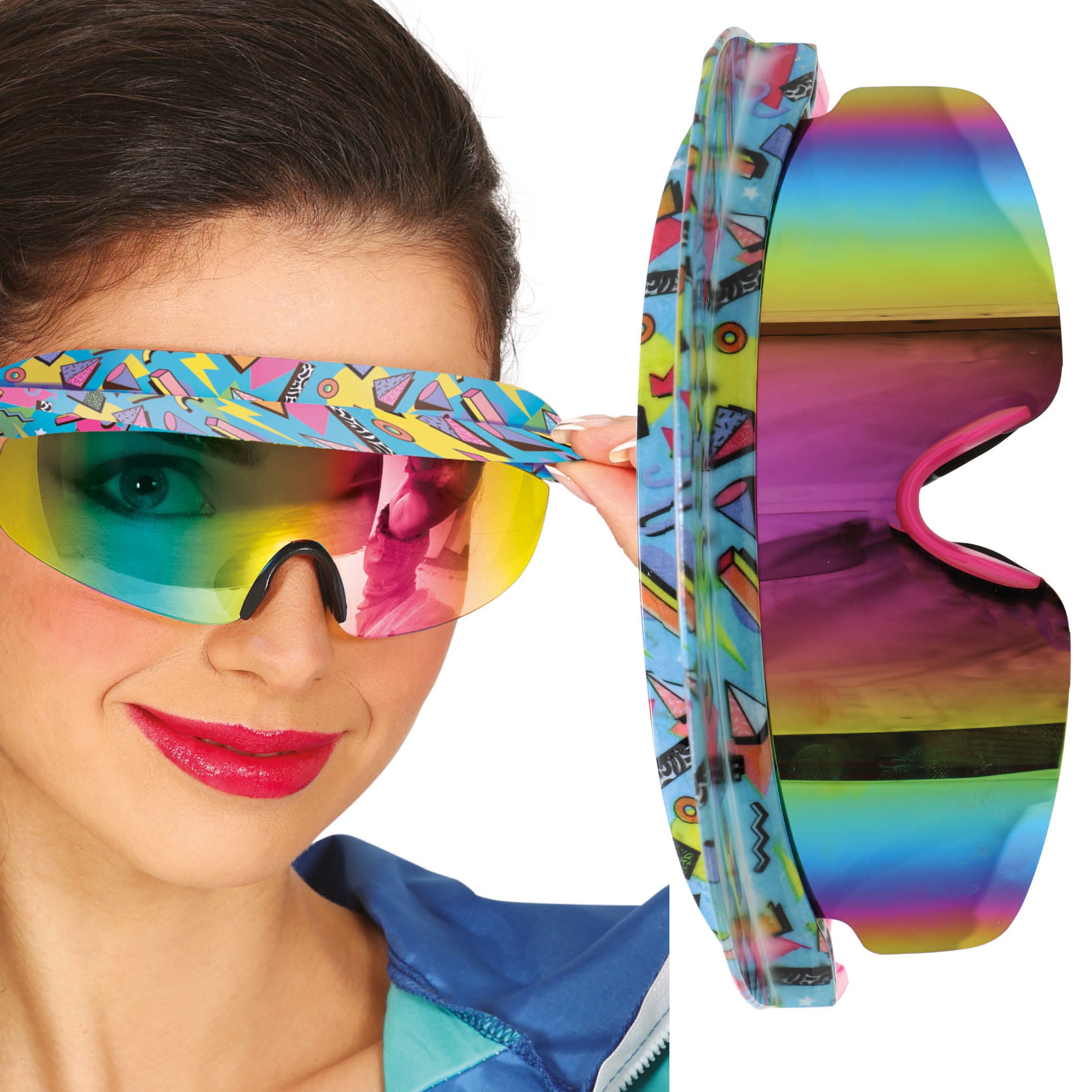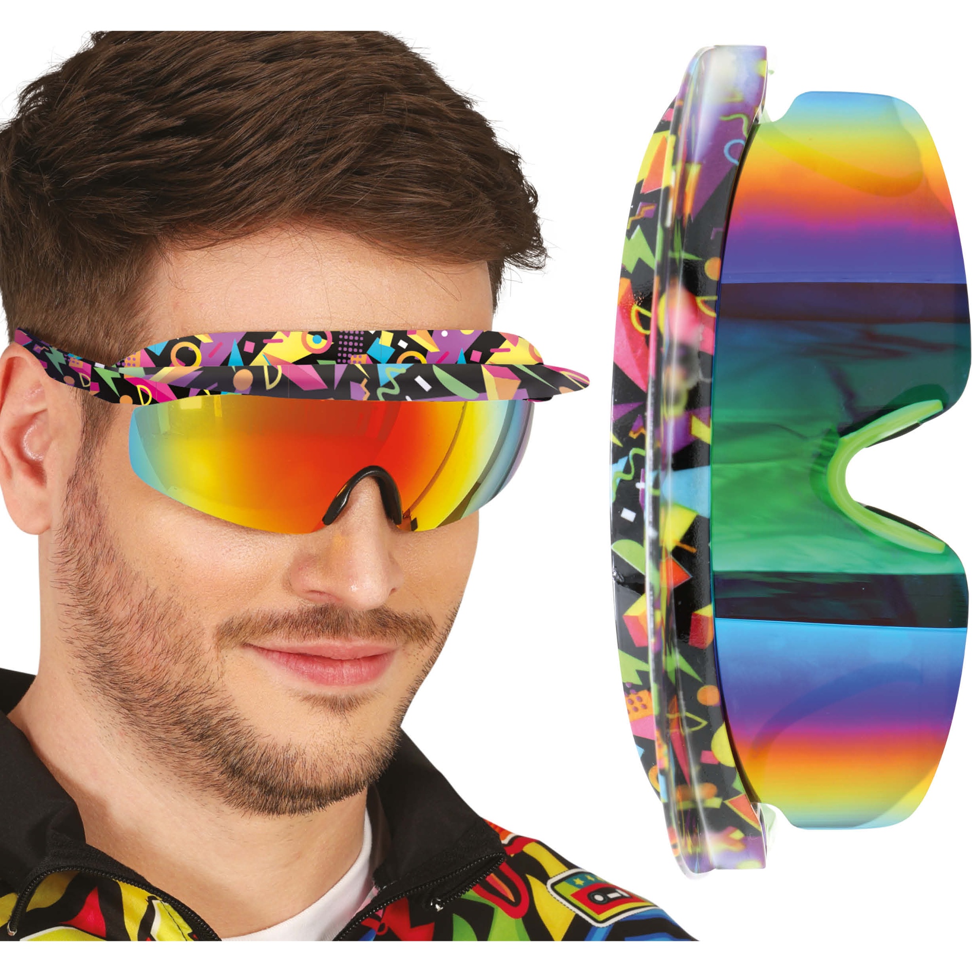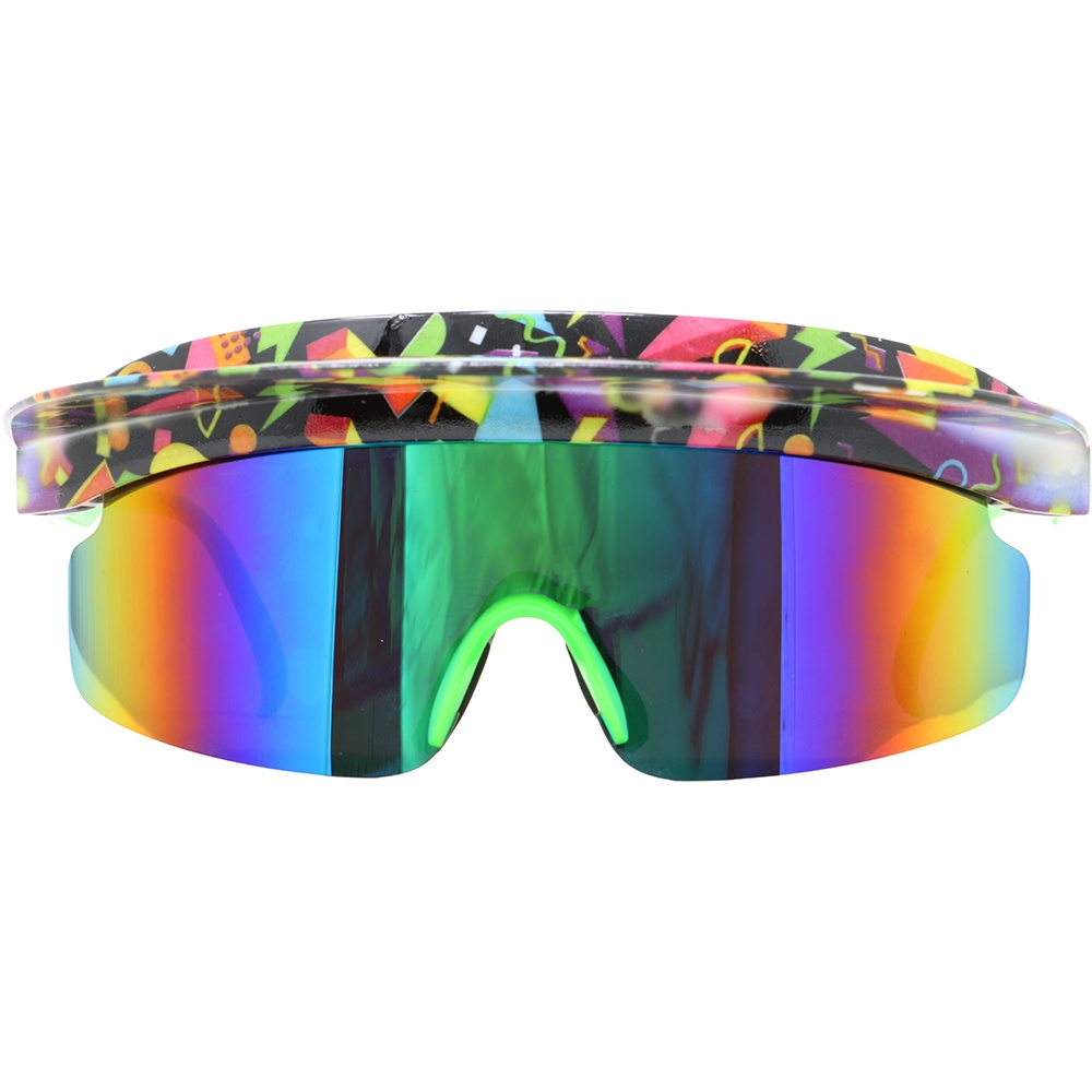 Occhiali anni '80 con design sportivo a visiera e lente specchiata dai colori intensi. La montatura avvolgente dona un look anni '80 immediato e di grande impatto. Dispongono di cinturino elastico regolabile per una calzata sicura e confortevole. Leggeri ed ergonomici, pensati per essere indossati a lungo senza fastidi. Ideali per chi cerca un accessorio retrò dal forte carattere.