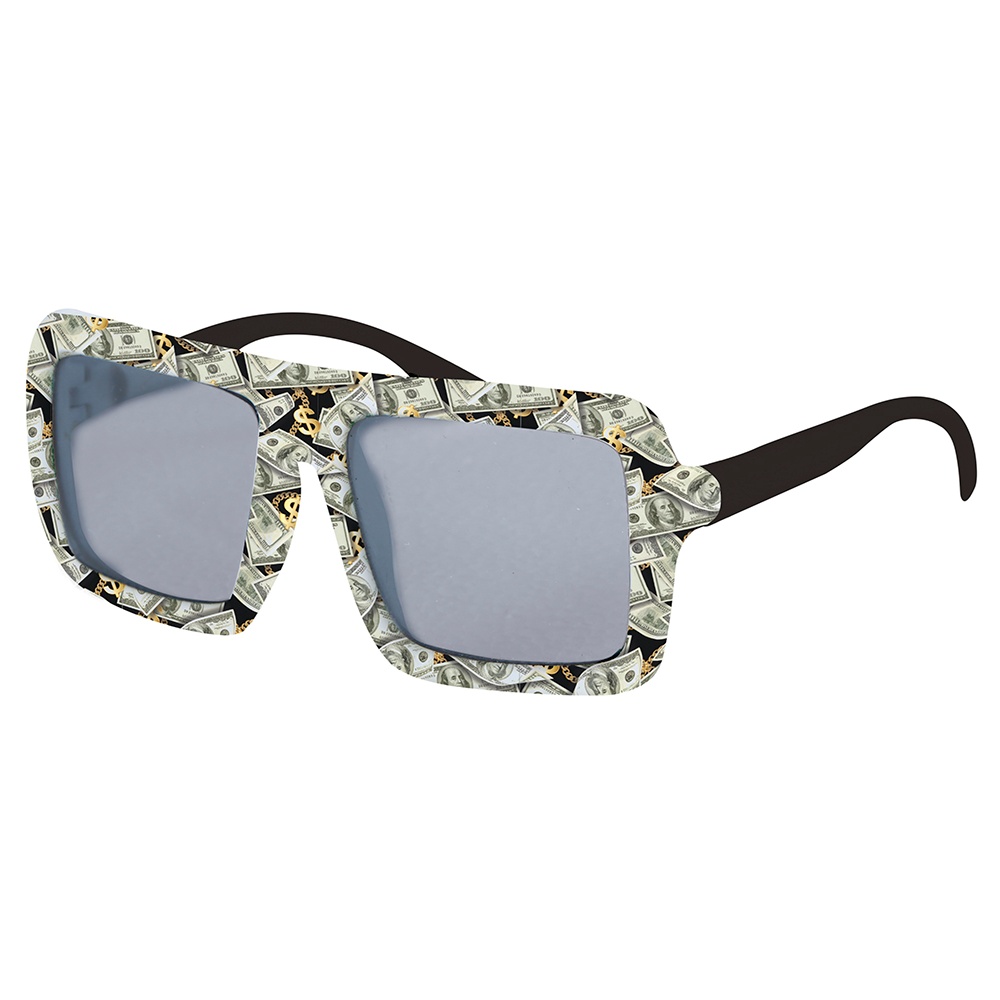 Occhiali con stampa di banconote dal design audace, perfetti per dare un tocco divertente e originale al tuo look. La montatura rettangolare e le lenti fumé creano un effetto moderno e di grande impatto. Realizzati in PVC leggero per garantire comfort anche durante lunghe serate. L'accessorio ideale per distinguersi a feste, carnevali e servizi fotografici.
