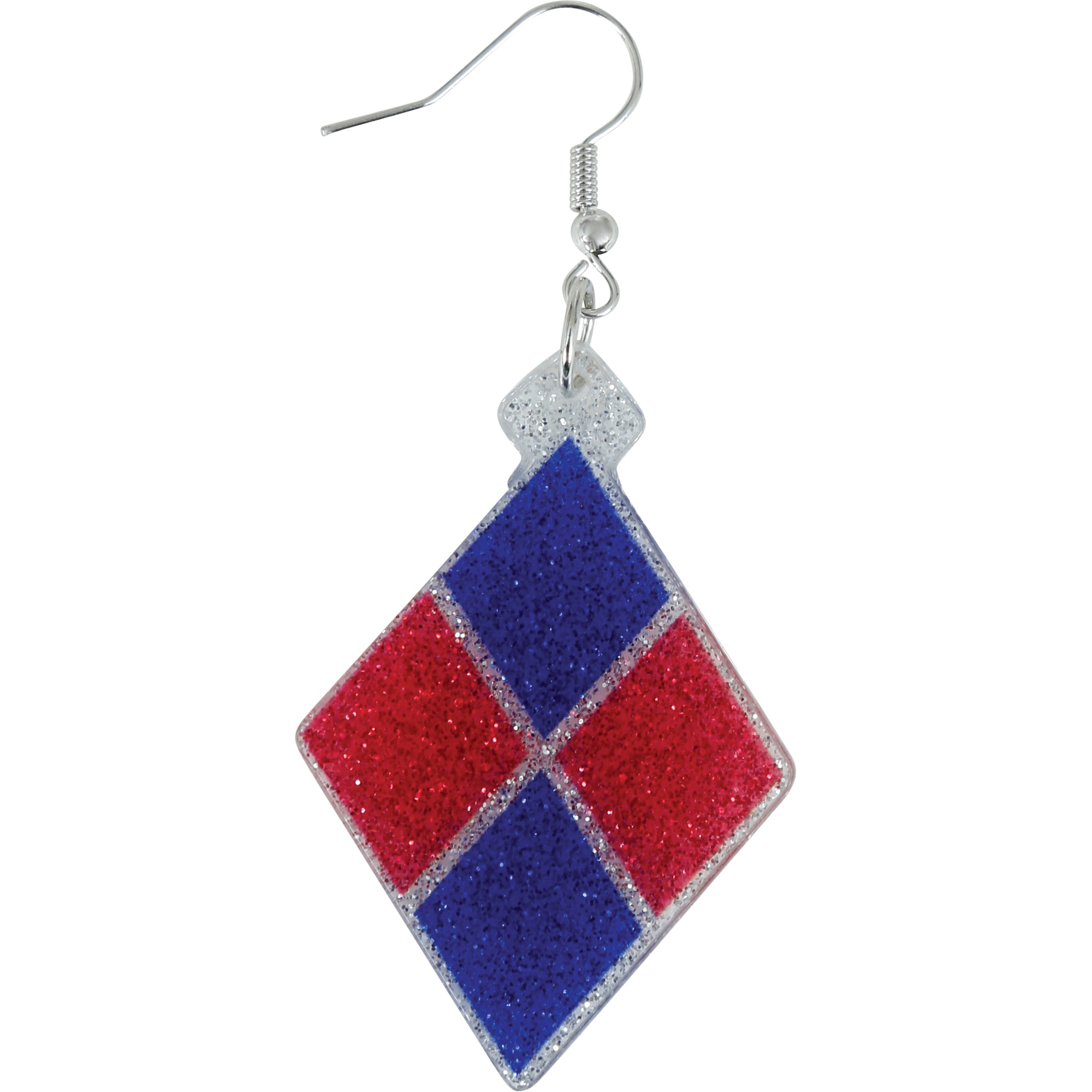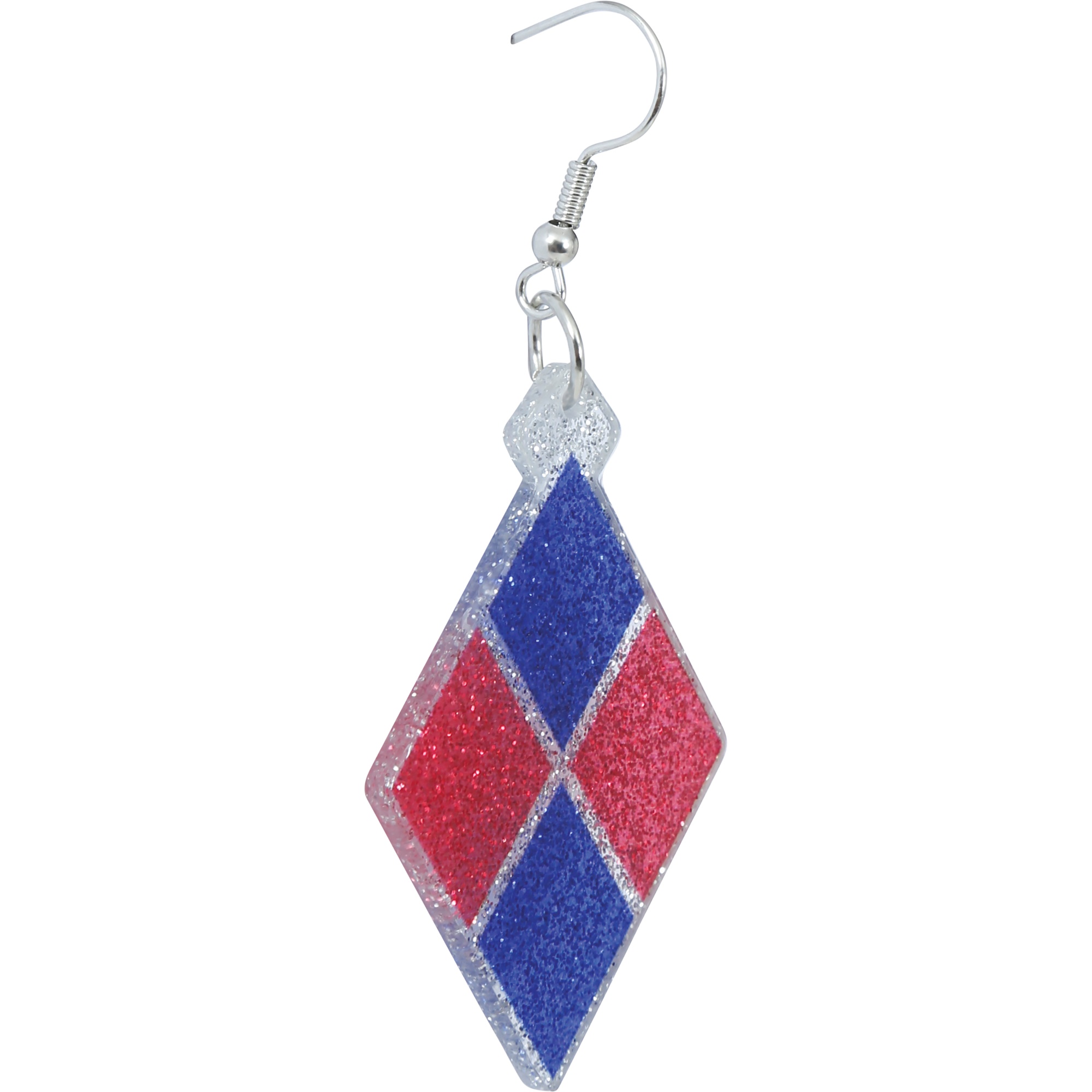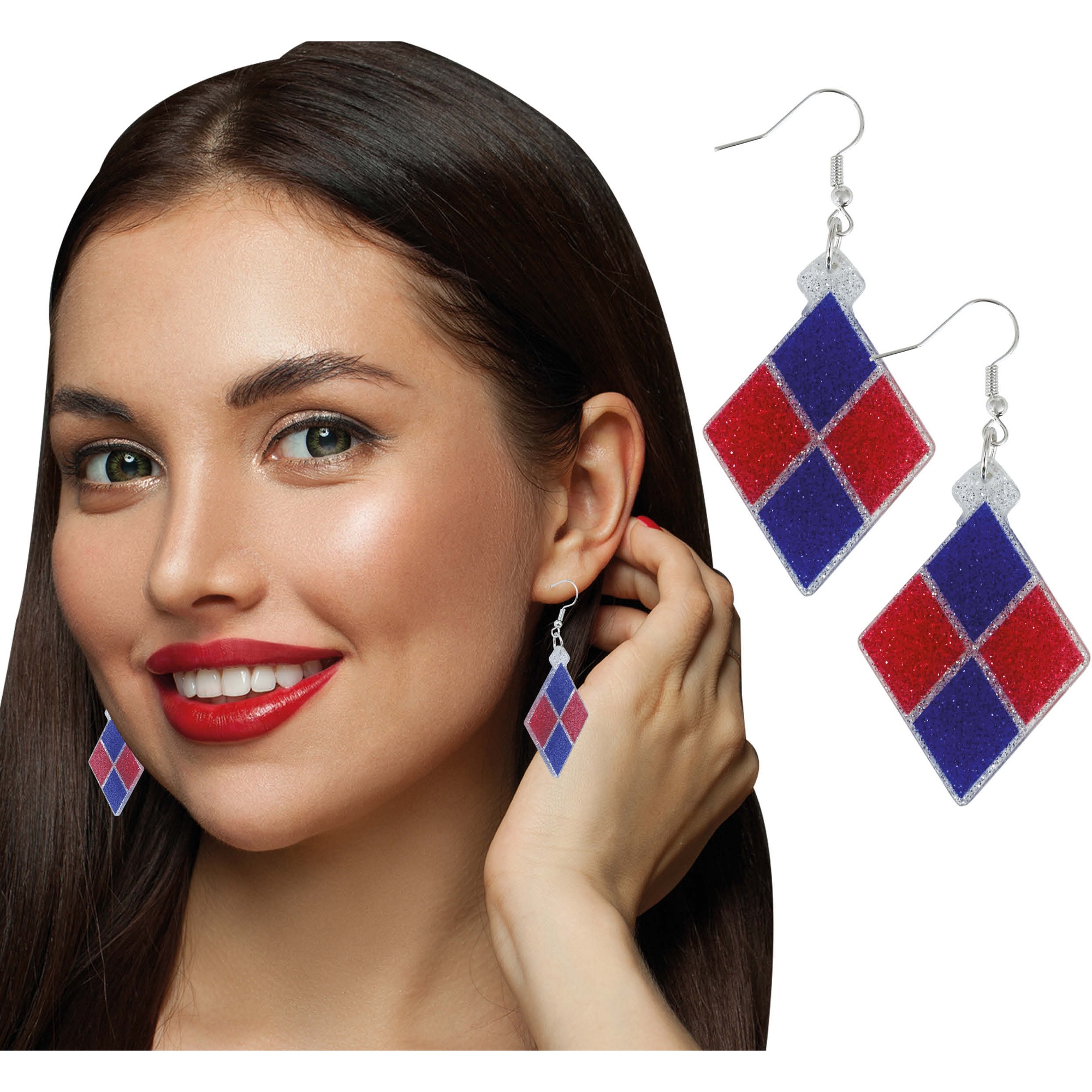 Orecchini pendenti con motivo a rombi nei classici colori rosso e blu, ispirati allo stile di Harley Quinn.