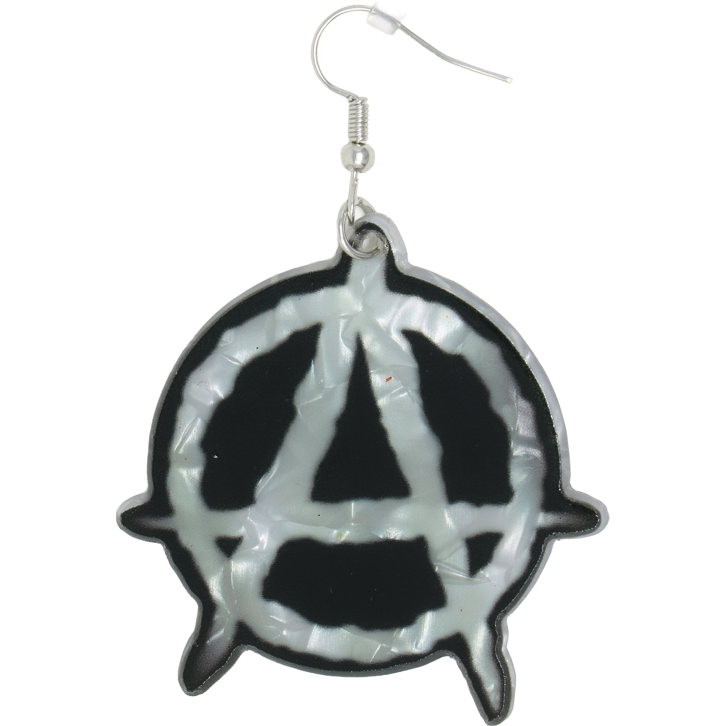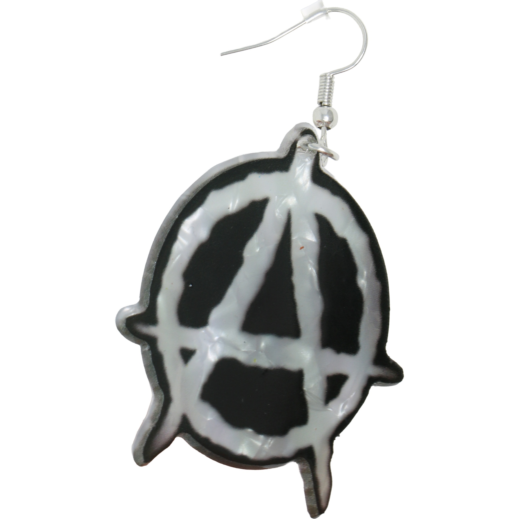 Orecchini punk con simbolo dell'anarchia. Design audace e riconoscibile che aggiunge un tocco ribelle ai tuoi look gotici e da cosplay. Realizzati in metallo e PVC per un contrasto definito e un finish d'impatto. Dotati di gancio ad amo (fishhook) per una rapida applicazione e comfort durante l'uso. Accessorio leggero pensato per distinguerti in costumi, servizi fotografici o outfit alternativi.