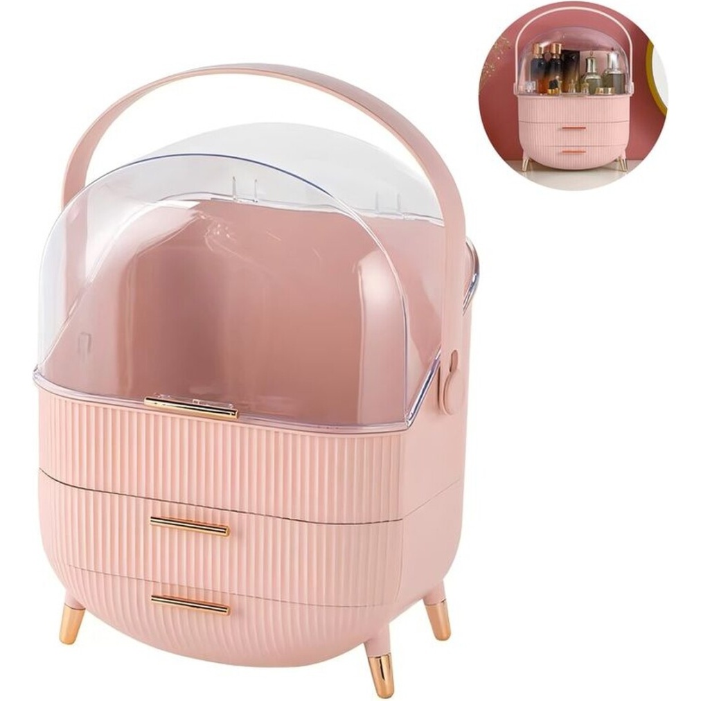 Organizer cosmetico portatile in tono rosa con coperchio trasparente e design elegante. Ideale per mantenere trucco e accessori ordinati e sempre in vista.