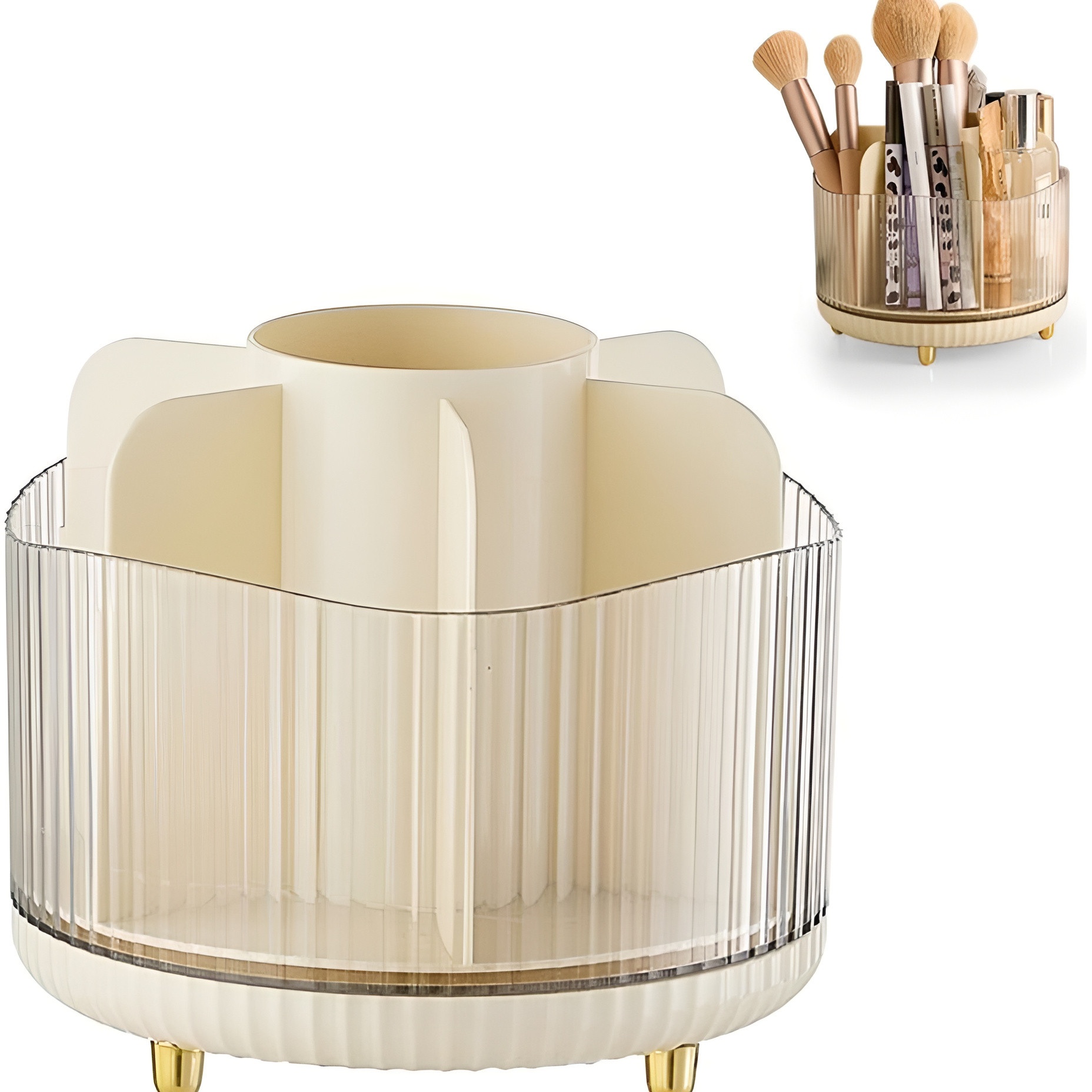 Organizza e consulta facilmente pennelli e prodotti per il trucco con questo organizzatore girevole a 360°. Il design compatto ed elegante porta ordine al piano trucco e rende immediato trovare ogni utensile. Dispone di scomparti a diverse altezze per separare pennelli, matite e flaconi, mantenendo tutto visibile e facilmente accessibile. Un complemento funzionale e decorativo che migliora la routine di trucco quotidiana.