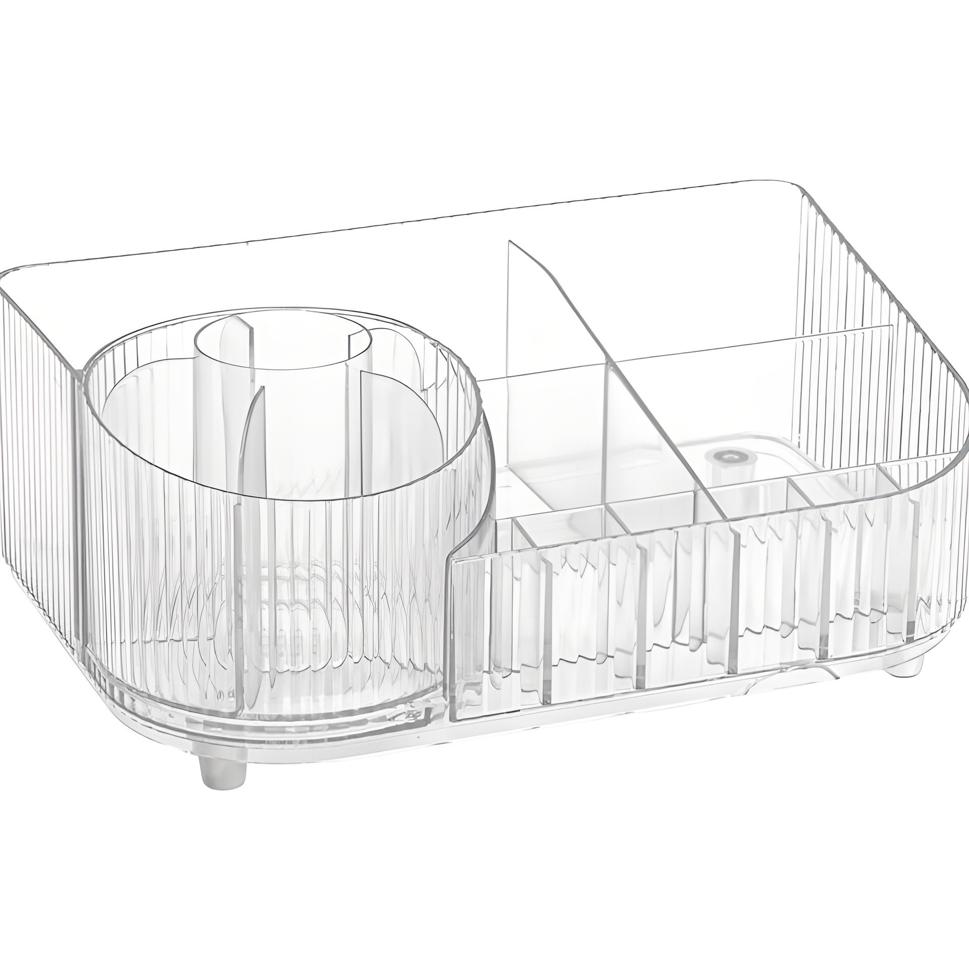 I suoi scomparti di varie dimensioni permettono di classificare i prodotti per tipo e misura, mentre il porta-pennelli centrale mantiene i pennelli in posizione verticale per un accesso immediato. Il design compatto e traslucido ottimizza lo spazio sul piano trucco senza rinunciare allo stile.