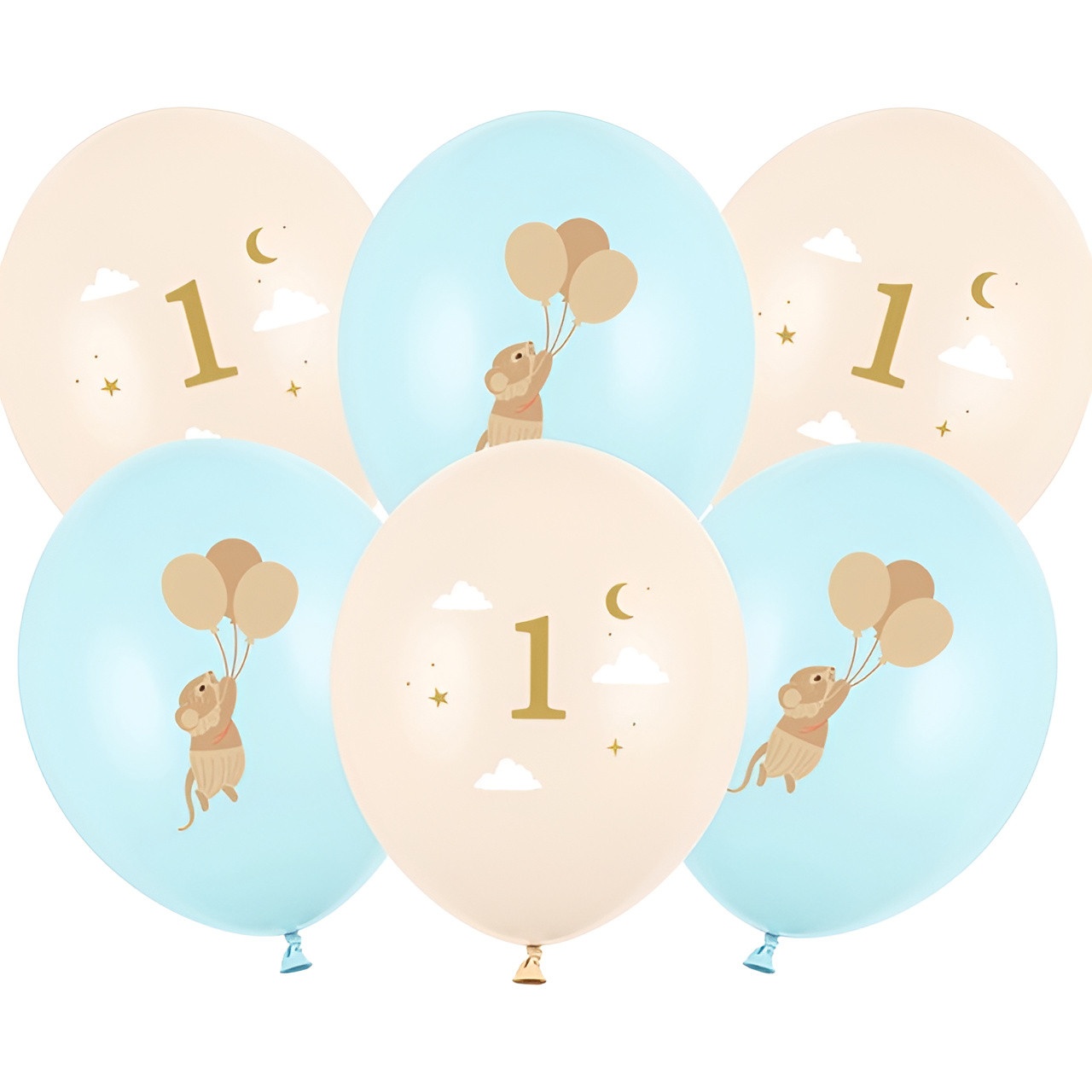 Palloncini perfetti per festeggiare il primo compleanno con un tenero motivo di topolino e il numero 1 in toni pastello che aggiunge un tocco delicato alla decorazione.