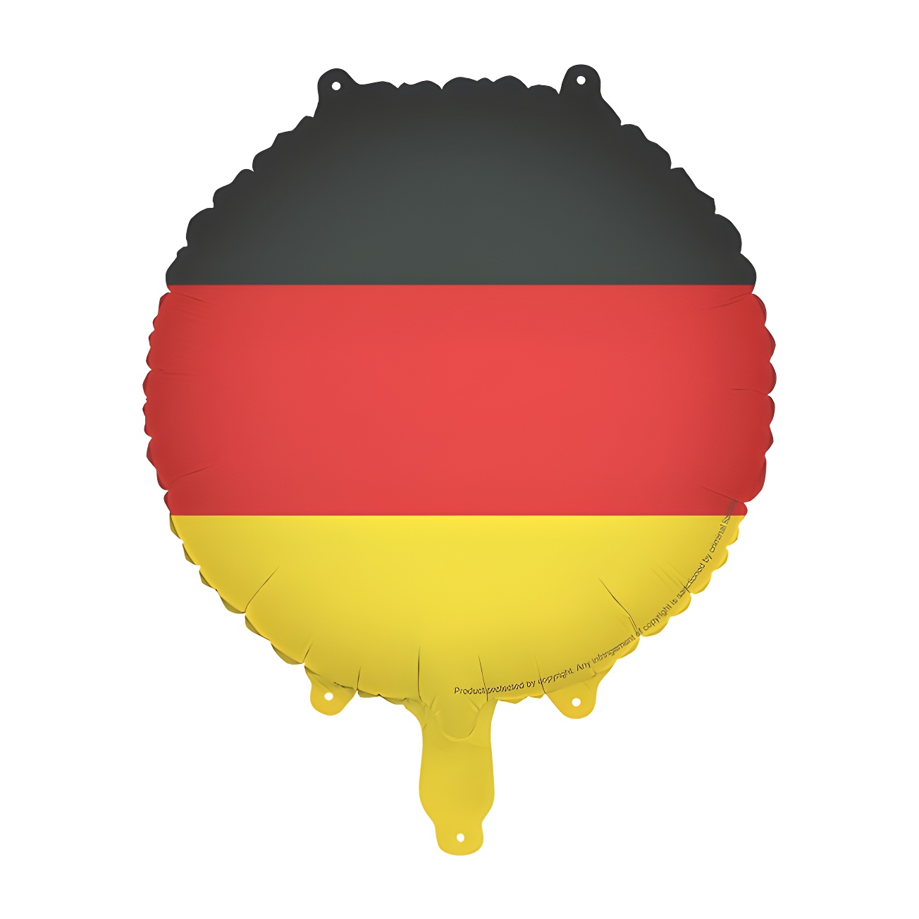 Palloncino in foil con stampa della bandiera della Germania, pensato per tifosi e celebrazioni sportive. Diametro prima del gonfiaggio circa 45 cm (18''), diametro dopo il gonfiaggio circa 35 cm (14''). Adatto per gonfiaggio ad aria o a elio. Il palloncino è dotato di sistema di auto-sigillatura e di anelli per appenderlo con facilità agli allestimenti.