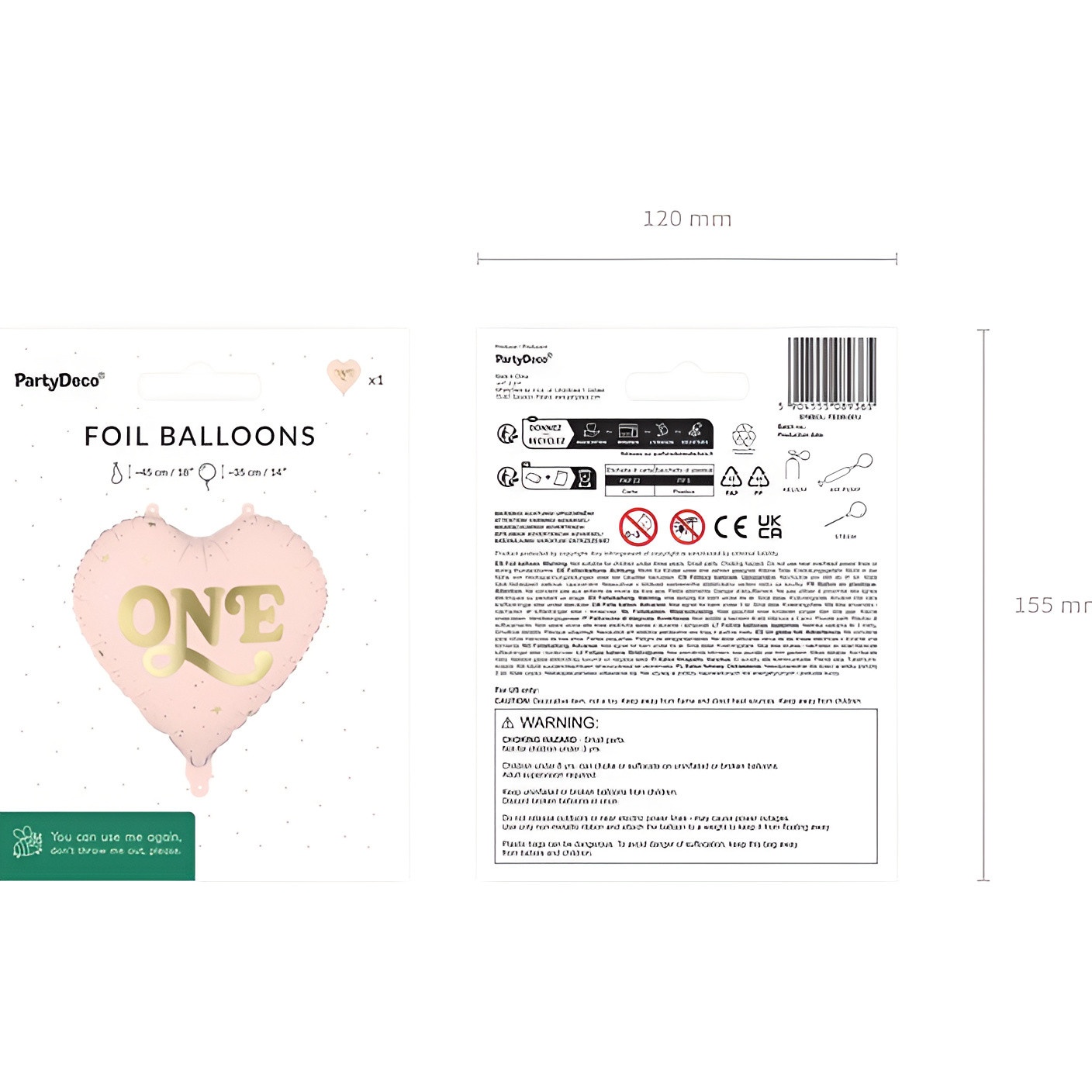 Dimensioni indicative prima del gonfiaggio: 45 cm (18") e dopo il gonfiaggio: 35 cm (14"). Può essere gonfiato ad aria o a elio; il foil mantiene lucentezza e forma nel tempo.