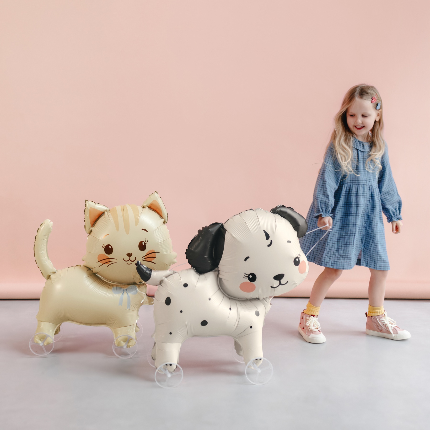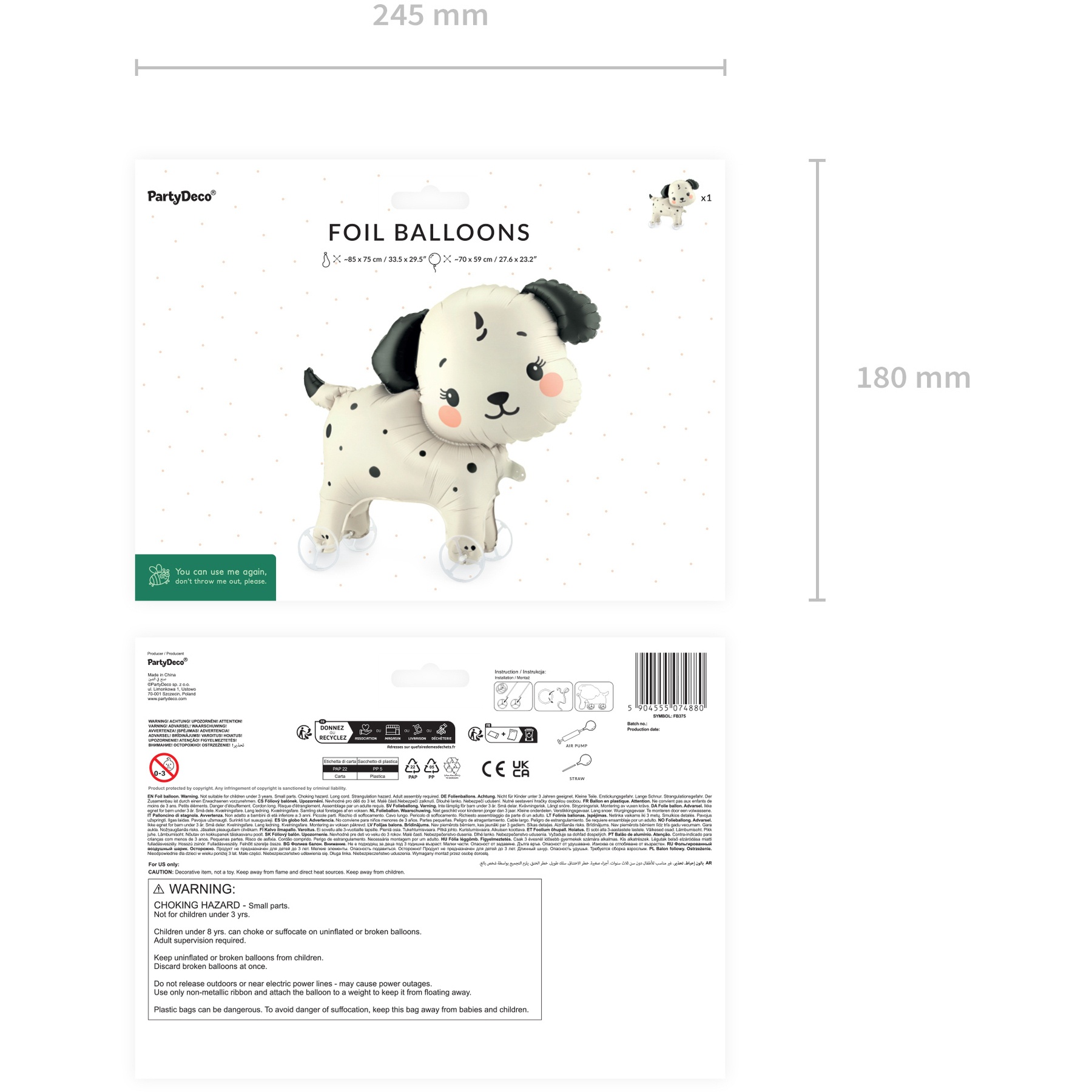 Palloncino foil a forma di cane con ruote in finitura beige e nera. Una volta gonfio misura circa 70 x 59 cm, offrendo un elemento decorativo di grande formato e forte impatto visivo; da sgonfio misura approssimativamente 85 x 75 cm. Si gonfia esclusivamente ad aria, per un montaggio e un'esposizione semplici. Le ruote permettono al palloncino di scivolare dolcemente su superfici lisce, aggiungendo movimento e divertimento. Design dolce e moderno, ideale per allestimenti e feste per bambini.