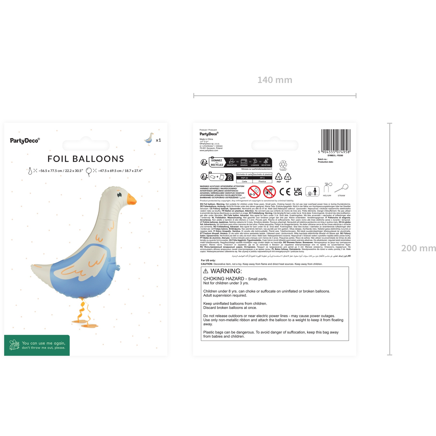 Palloncino in foil a forma di oca tipo walking con design in avorio e "pantalone" azzurro chiaro, ideale per decorare compleanni e feste per bambini. Si gonfia con elio per ottenere il caratteristico effetto di movimento.