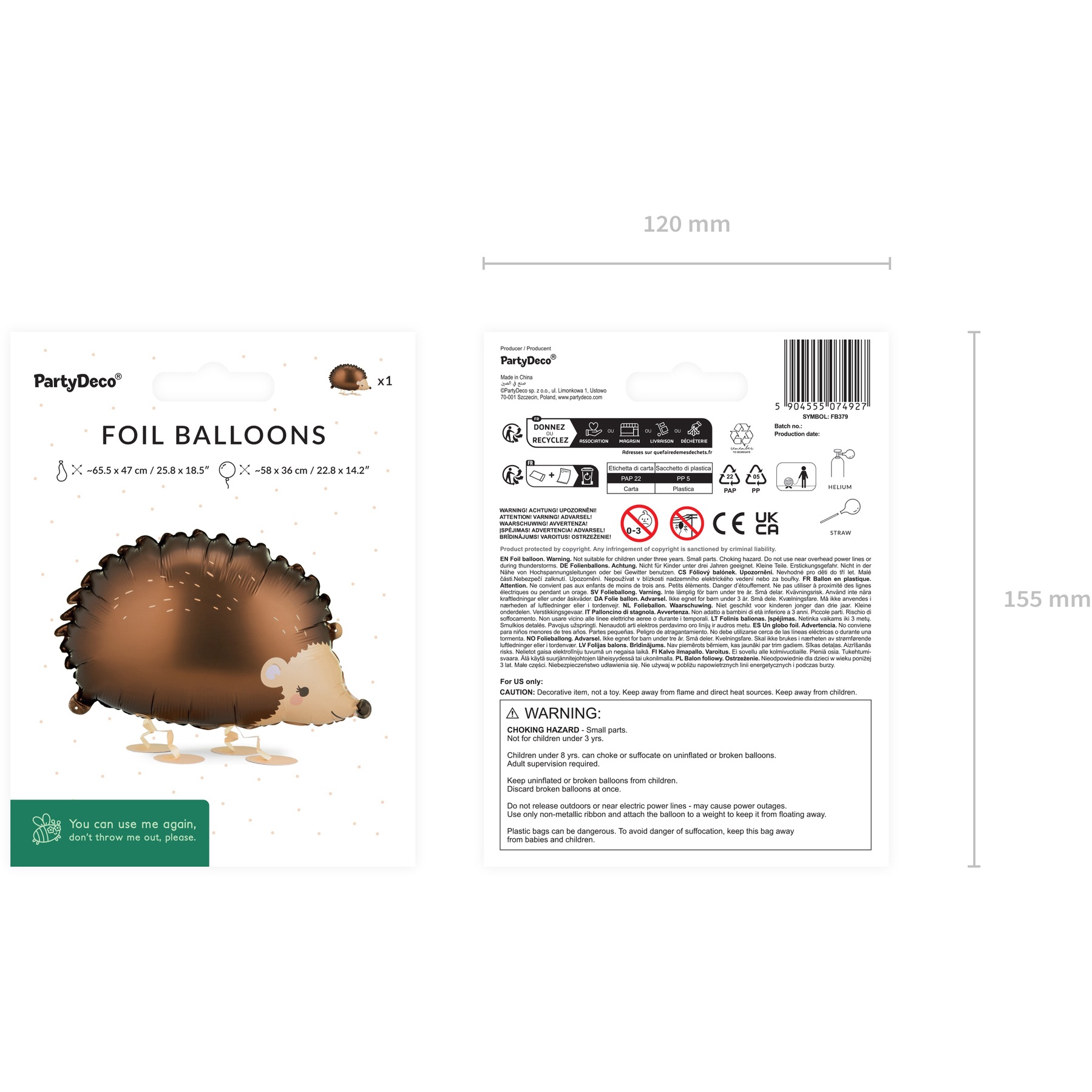 Palloncino foil a forma di riccio 'in cammino” in toni marroni, dal aspetto simpatico e d'impatto, pensato per decorare celebrazioni e compleanni per bambini. Dimensioni prima del gonfiaggio: circa 65,5 x 47 cm; dopo il gonfiaggio: circa 58 x 36 cm. L'altezza delle zampette è di circa 10 cm, permettendo al palloncino di sostenersi come se camminasse su superfici piane. Ideale da gonfiare con elio per aggiungere un dettaglio divertente e molto fotogenico alla decorazione.