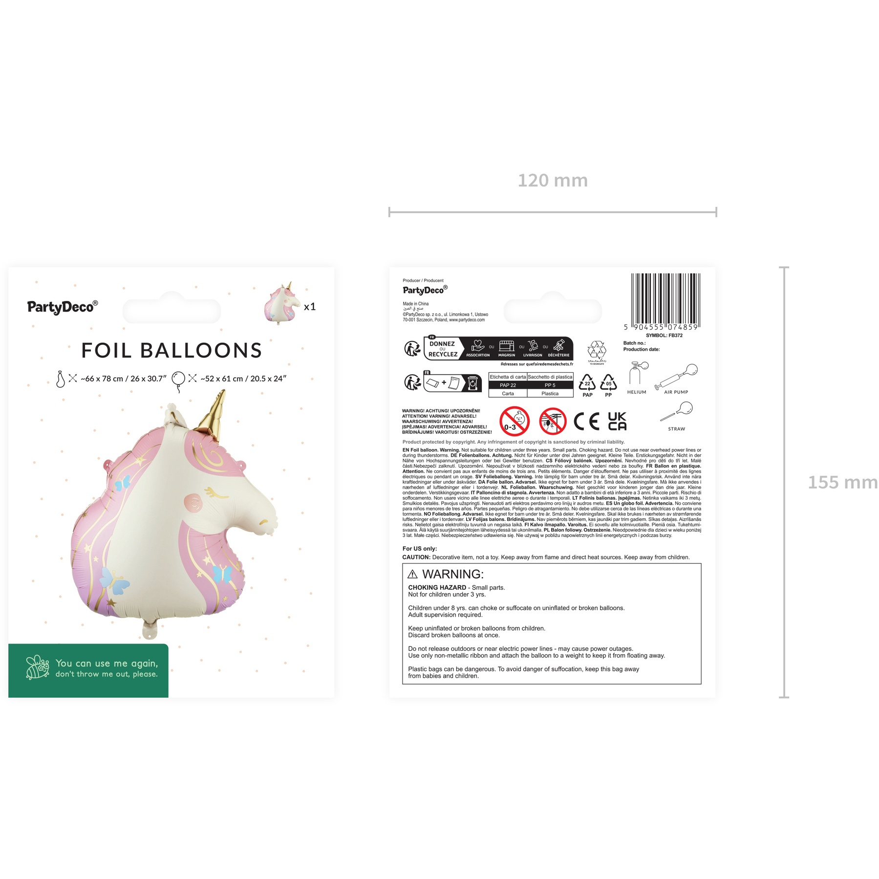 Le dimensioni prima del gonfiaggio sono circa 66 x 78 cm; una volta gonfio misura circa 52 x 61 cm. Adatto al gonfiaggio sia con aria che con elio.
