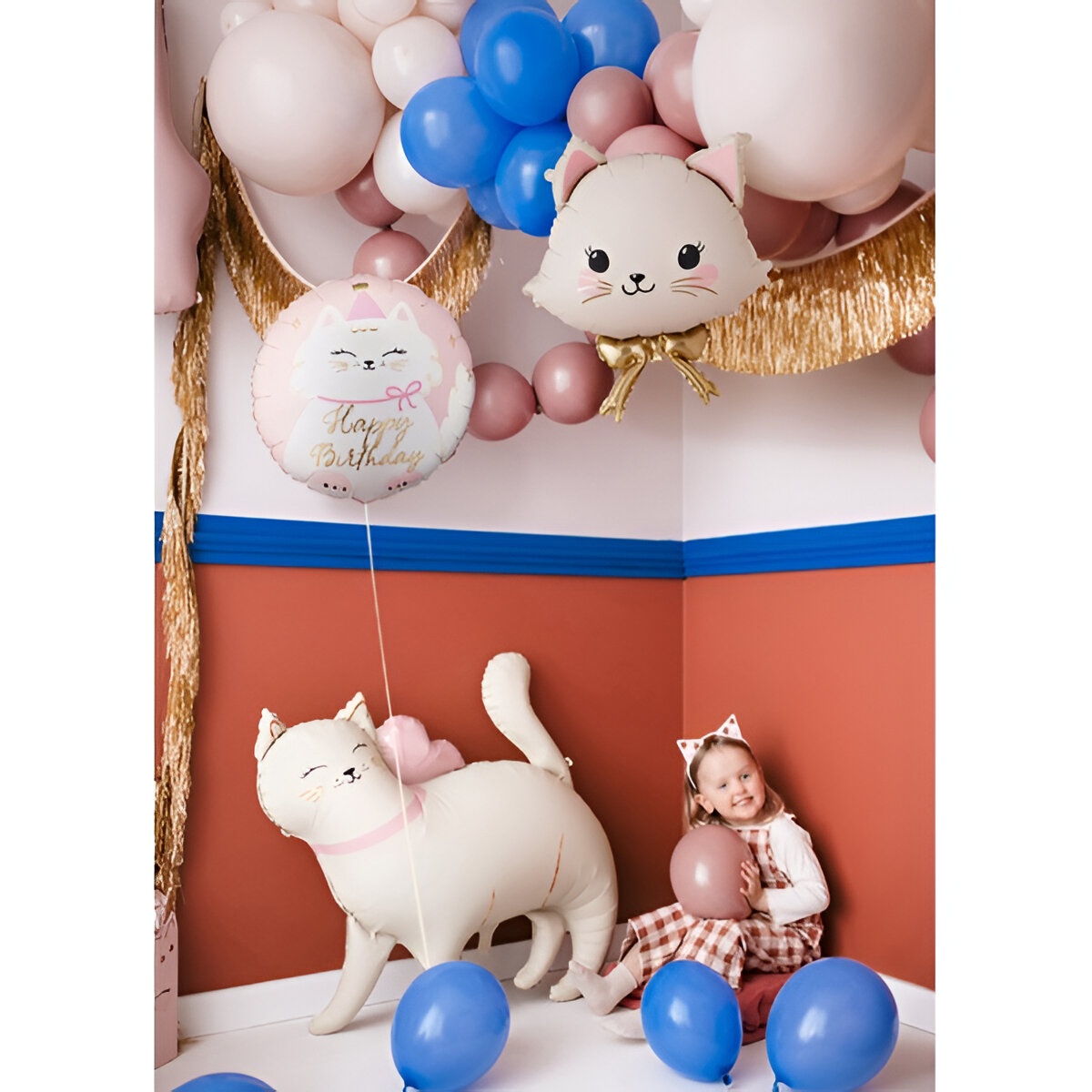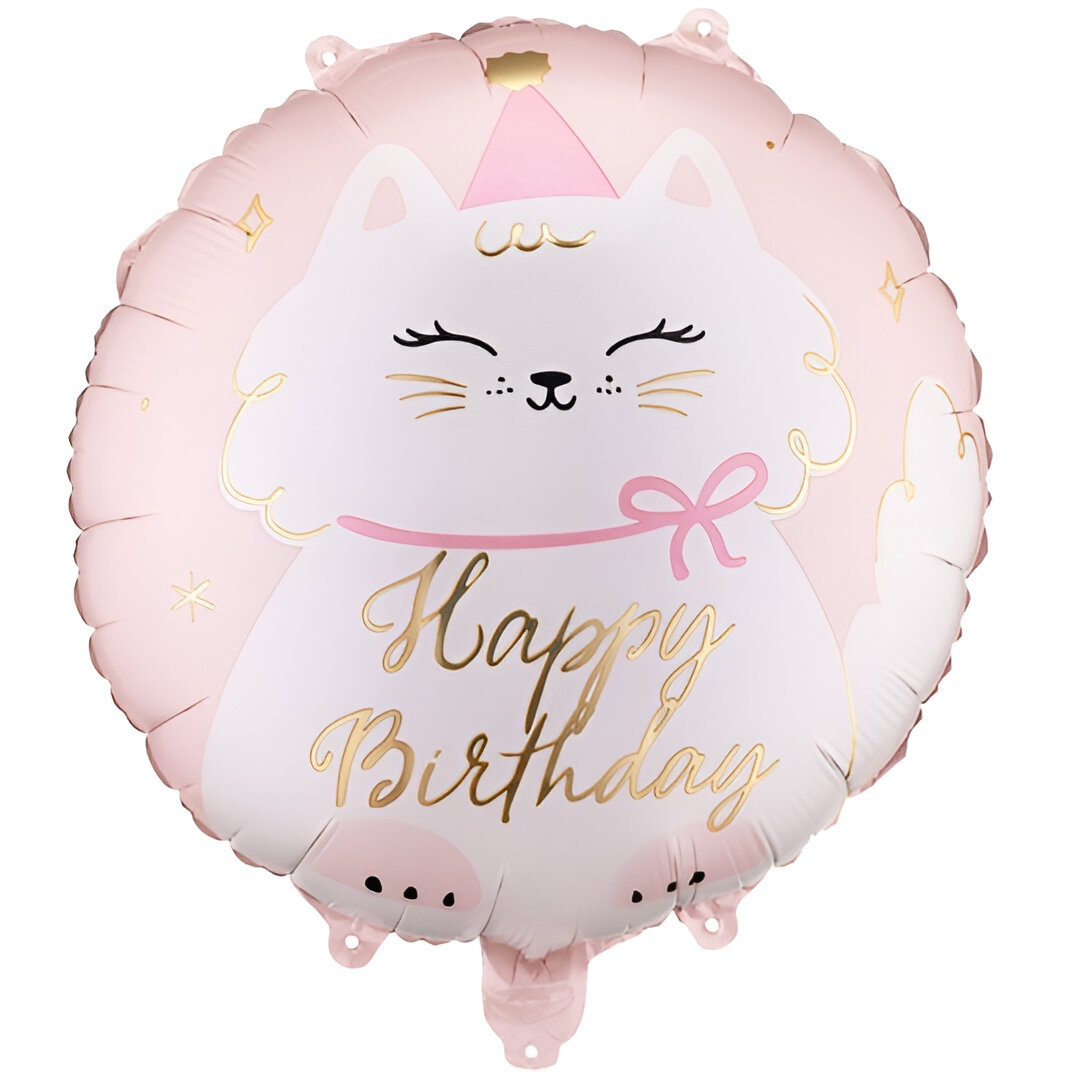 Palloncino foil a disco con un tenero motivo di gattino e la scritta "Happy Birthday" in dettagli dorati. Colori assortiti e tonalità delicate pensate per le celebrazioni dei bambini.