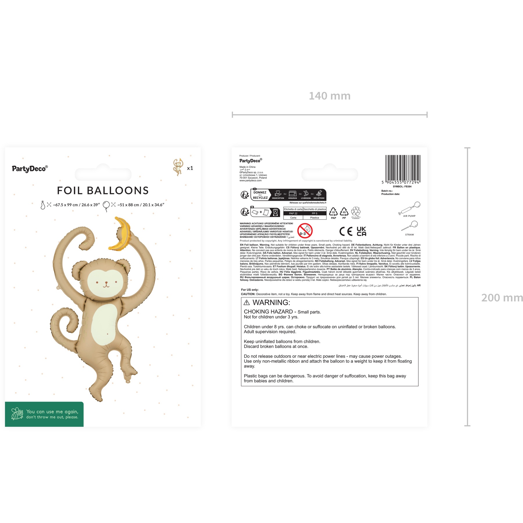 Palloncino in foil a forma di scimmia nei toni beige e crema, perfetto come elemento centrale nelle decorazioni per feste e ambientazioni infantili a tema giungla. L'espressione dolce e la sagoma originale aggiungono un tocco accogliente e scenografico a compleanni e servizi fotografici. Dimensioni prima del gonfiaggio: circa 67,5 x 99 cm; dopo il gonfiaggio: circa 51 x 88 cm. Progettato per essere gonfiato solo ad aria, include una cannuccia per facilitare il gonfiaggio. Leggero e d'effetto, si combina facilmente con ghirlande, altri palloncini ed elementi decorativi a tema.