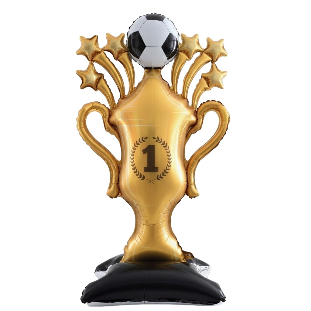 Palloncino trofeo gigante a forma di coppa con pallone, ideale per dare un tocco epico a ogni celebrazione sportiva.