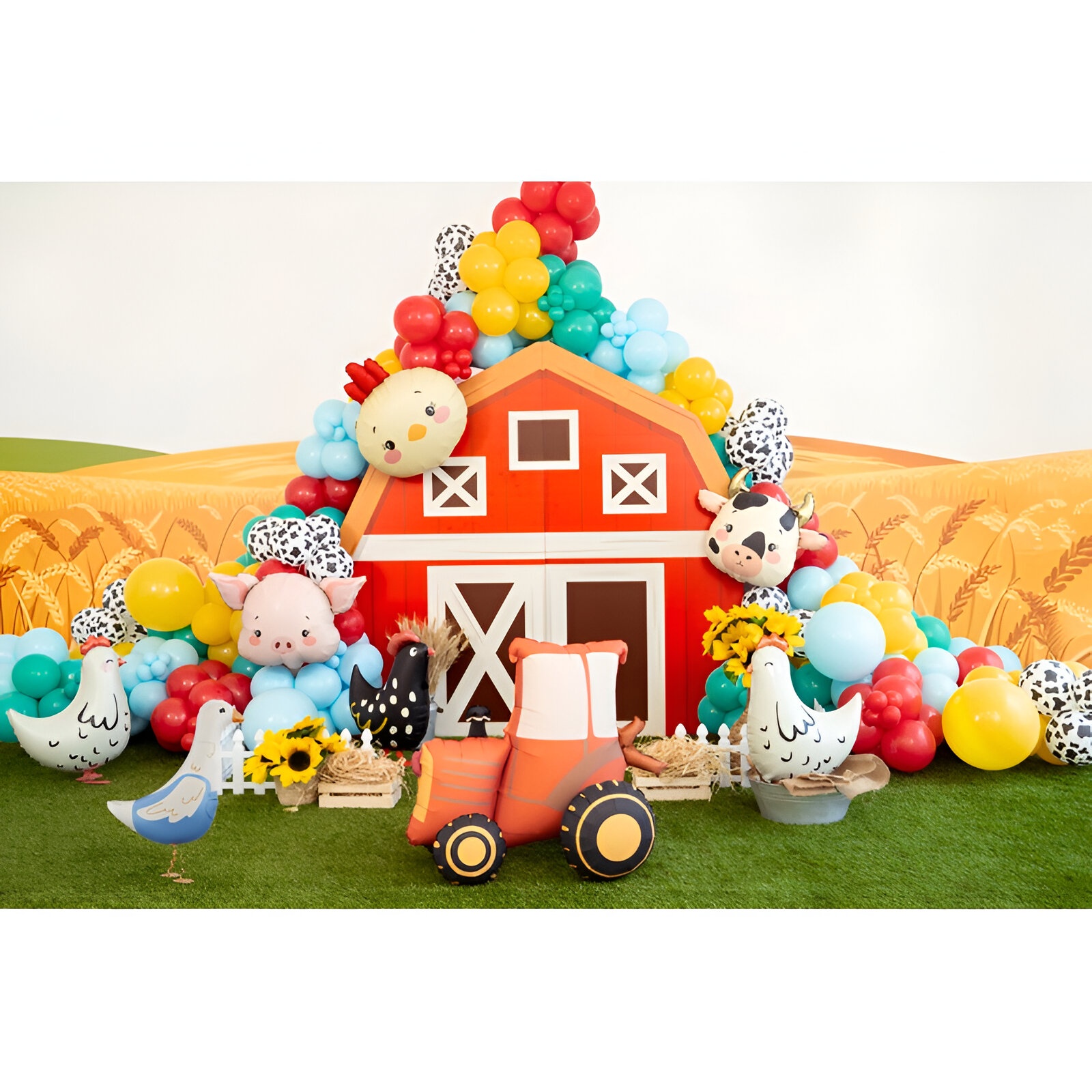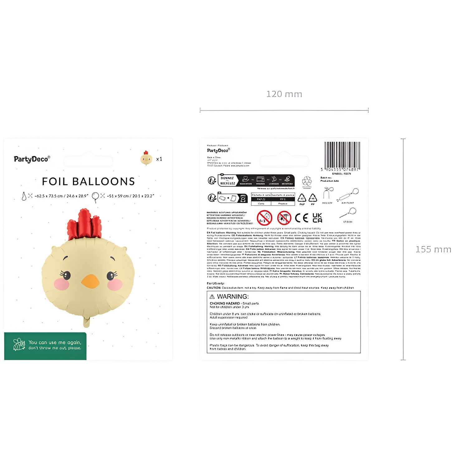 Palloncino in foil raffigurante una gallina nei colori giallo e rosso, con guance rosate e cresta 3D per un aspetto divertente e tenero.