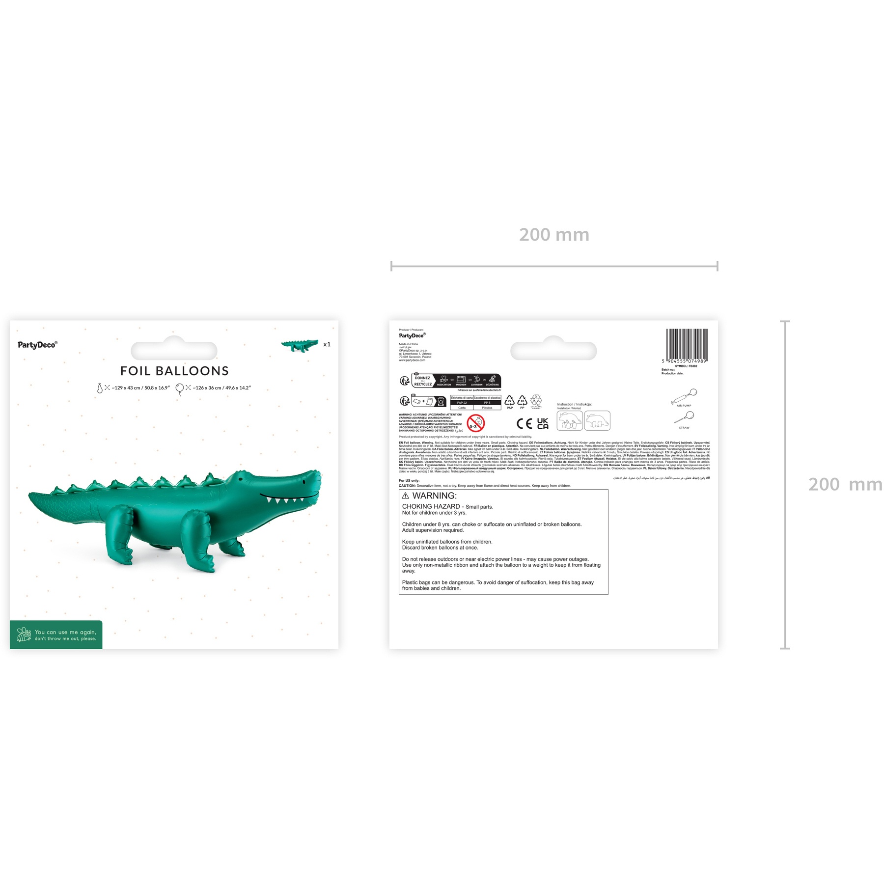 Pallone coccodrillo gigante in verde scuro, perfetto per creare un'atmosfera d'impatto a tema giungla. La sua silhouette allungata e tridimensionale cattura l'attenzione e dona un tocco divertente e originale a qualsiasi allestimento. Dimensioni approssimative prima del gonfiaggio 129 x 43 cm e dopo il gonfiaggio ca. 126 x 36 cm. Progettato per essere gonfiato solo ad aria, offre un elemento stabile e di grande effetto che funge da punto focale negli eventi.