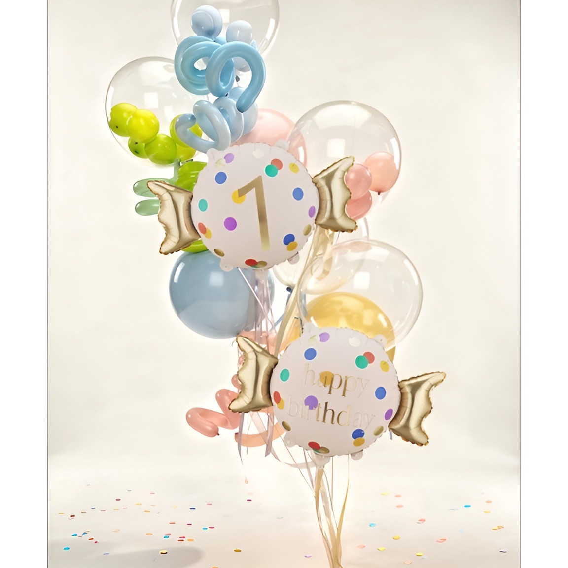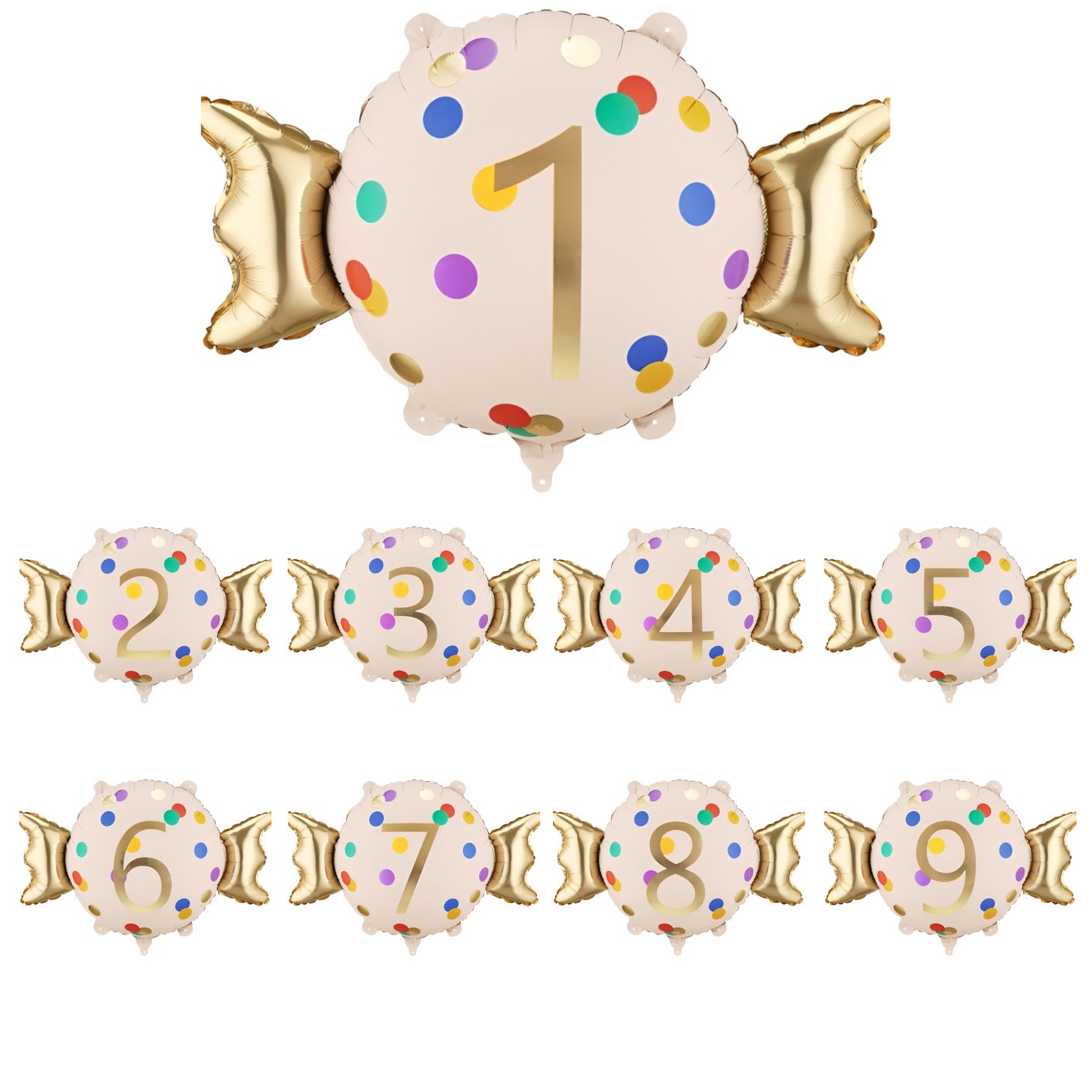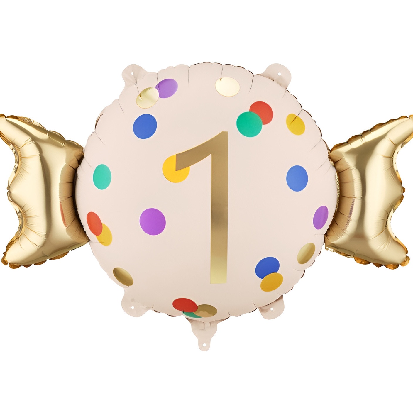 Palloncino decorativo con il numero 1 in elegante combinazione beige e oro. Presenta un design in stile "candy" con pois colorati che dona un tocco festoso e sofisticato. Dimensioni approssimative prima del gonfiaggio: 76,5 x 48 cm; dimensioni dopo il gonfiaggio: 61 x 37 cm. Adatto al gonfiaggio ad aria e all'elio, studiato per creare un punto focale nella celebrazione. Ideale per il primo compleanno, per sessioni fotografiche e per abbellire tavoli dei dolci o angoli speciali.