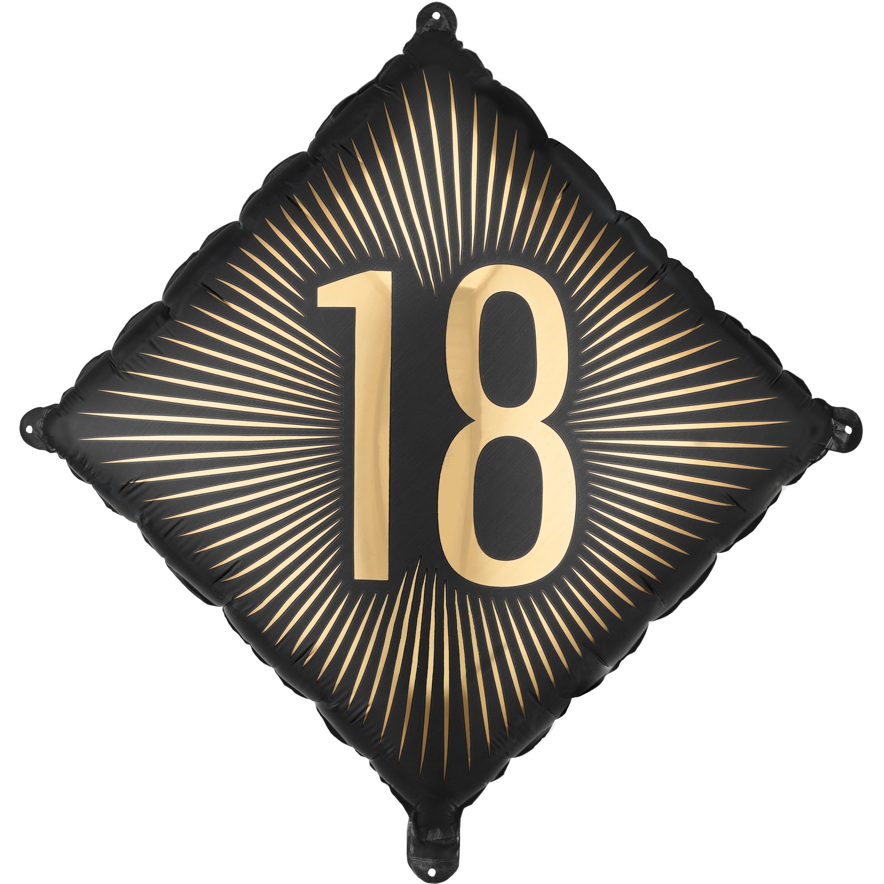Palloncino con finitura metallica nero e numero dorato "18" al centro, pensato come elemento scenografico per festeggiamenti del diciottesimo compleanno. Dimensioni approssimative prima del gonfiaggio: 54 x 54 cm (20 x 20"), e dopo il gonfiaggio: 46 x 46 cm (18 x 18"). Si può gonfiare ad aria o con elio a seconda delle esigenze decorative. Include una cannuccia per facilitare il gonfiaggio.