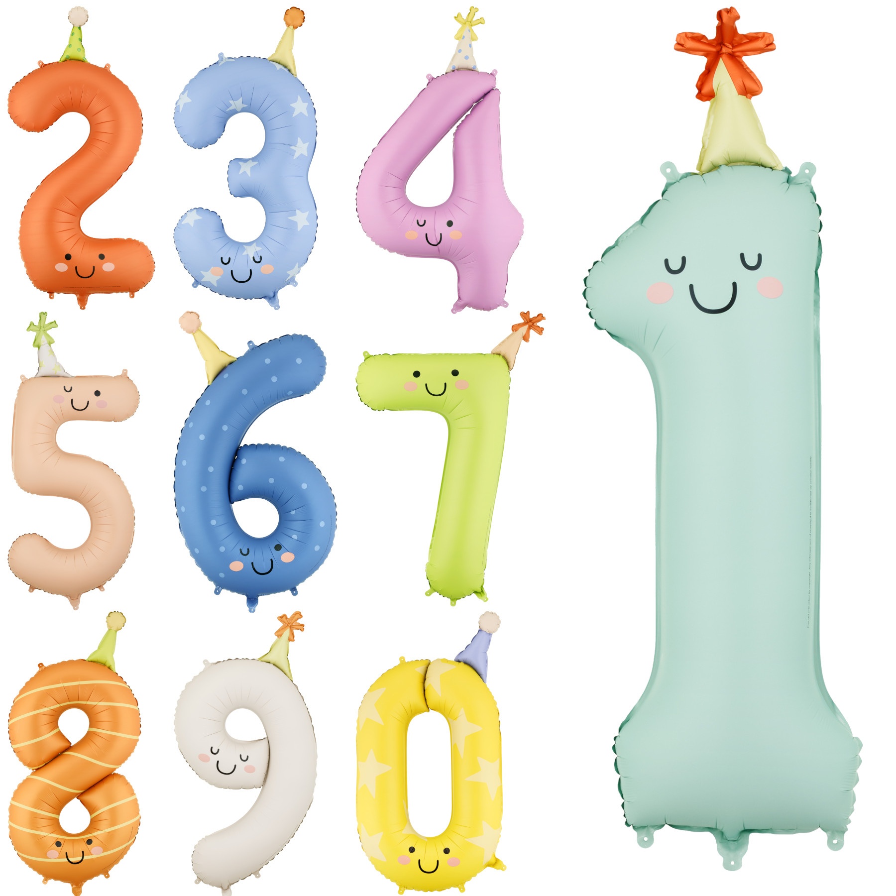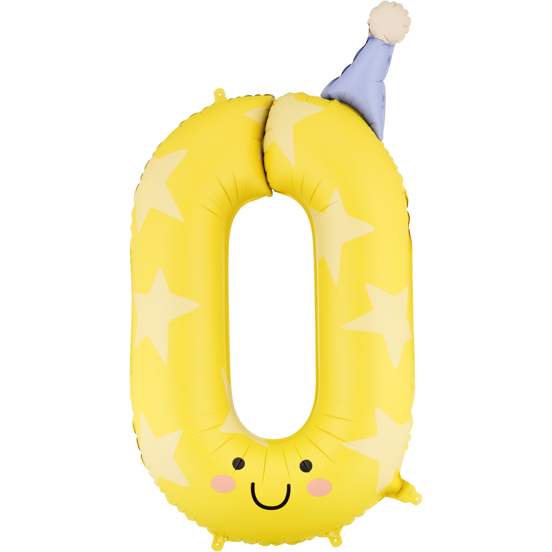 Palloncino foil numero 0, finitura opaca, colore giallo vivace con faccetta sorridente e cappellino colorato che aggiunge un tocco divertente e tenero.