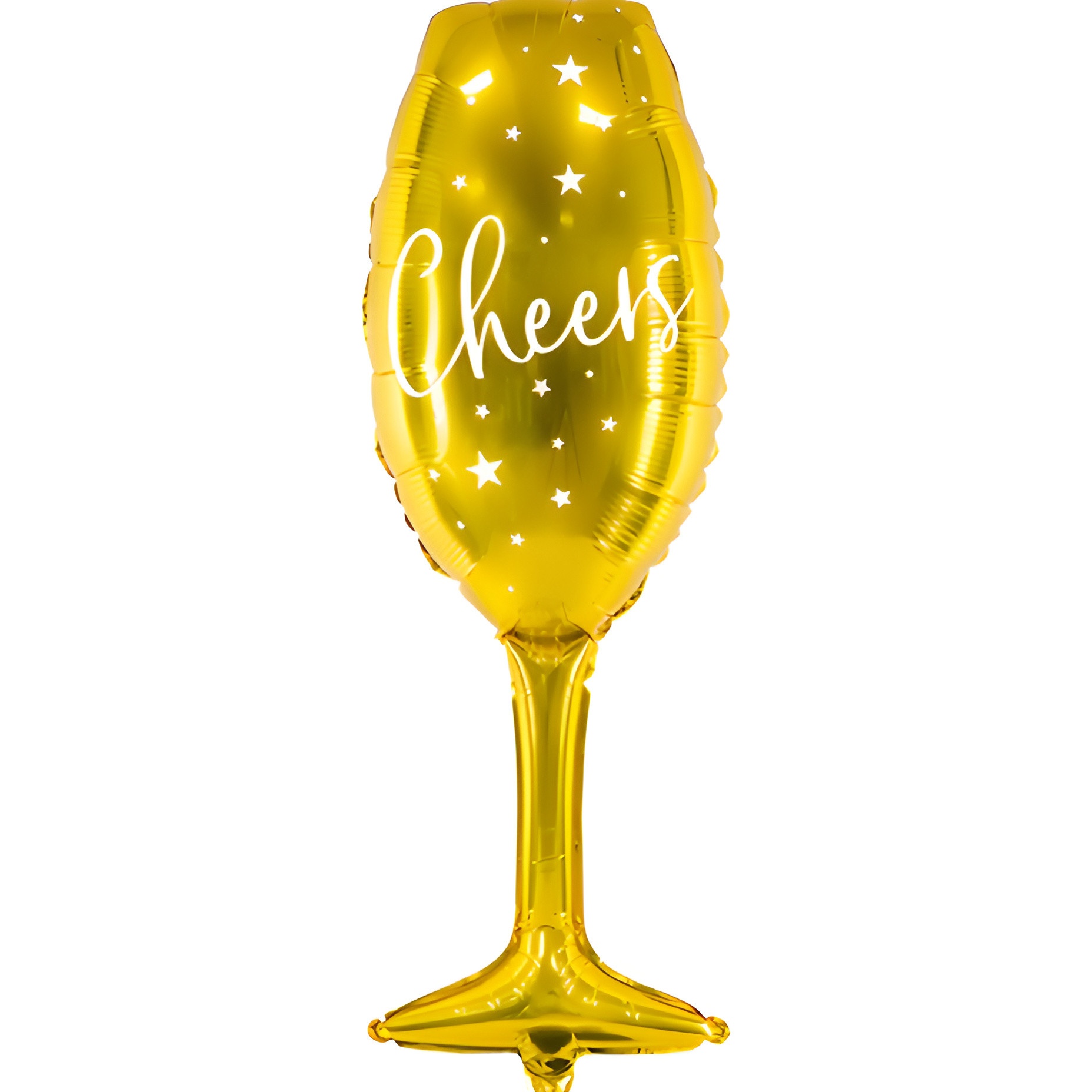 Realizzato in carta foil, questo pallone XL si caratterizza per la sua forma di coppa di colore dorato, con la scritta 'Cheers' in inglese e uno sfondo con una nuvola di stelle bianche. Può essere gonfiato con aria, anche se consigliamo l'elio, poiché gli permetterà di mantenere la sua posizione naturale.