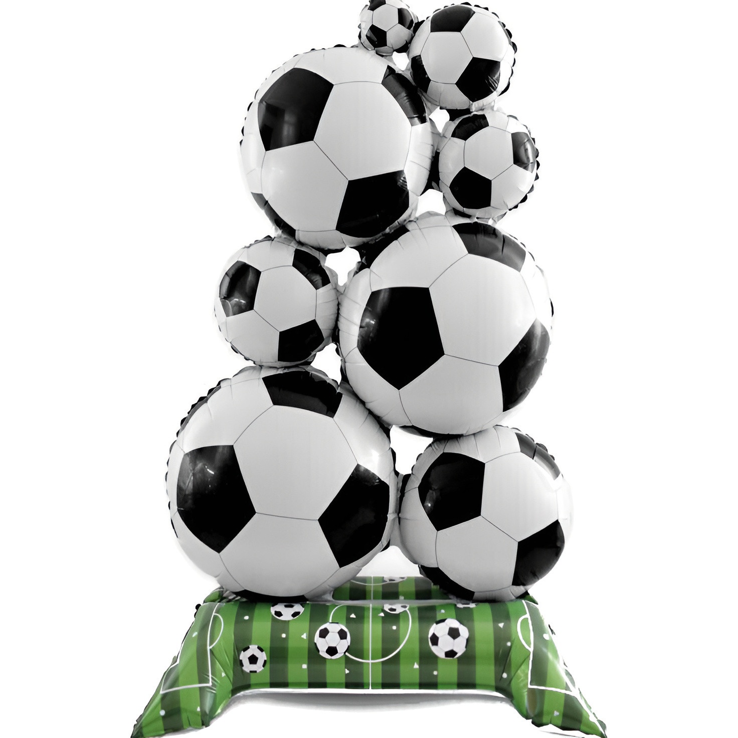 Pallone foil gigante con motivo campo da calcio e più palloni, perfetto per creare un forte impatto visivo in celebrazioni sportive o feste per bambini. La base con stampa prato funge da supporto decorativo valorizzando la composizione. Ideale per creare punti focali in compleanni, eventi a tema e per scatti fotografici memorabili.